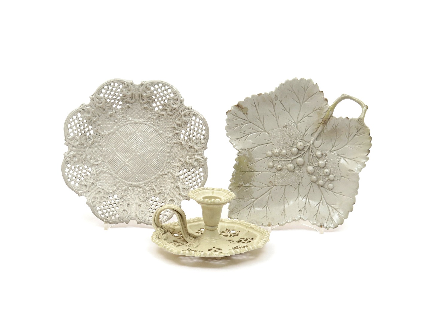 Two Staffordshire salt-glazed stoneware dishes c.1755, one modelled as a large leaf with three smaller leaves and two sprays of currants moulded to the well, the other with eight reticulated lobes to the rim, richly moulded with varying basketweave and diaper panels, and a Leeds Pottery creamware candlestick, with pierced decoration to the tray, some faults, 24cm max. (3)