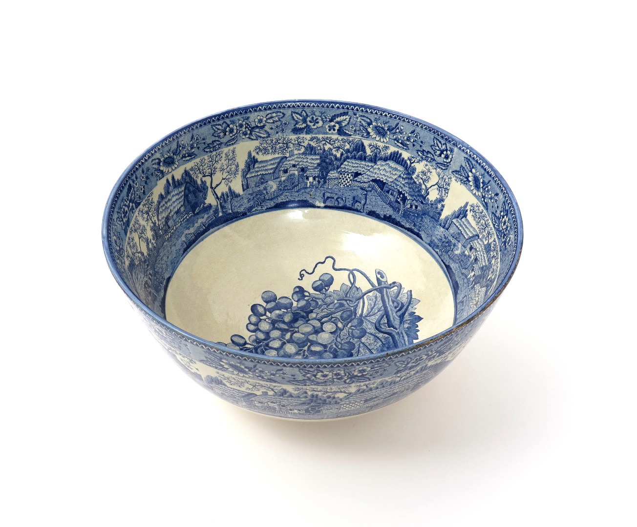 A massive Rörstrand pearlware punch bowl early 19th century, printed in blue to the exterior and interior rim with a continuous scene of livestock before thatched cottages, the interior well with a large bunch of grapes, impressed mark, 34.6cm dia.