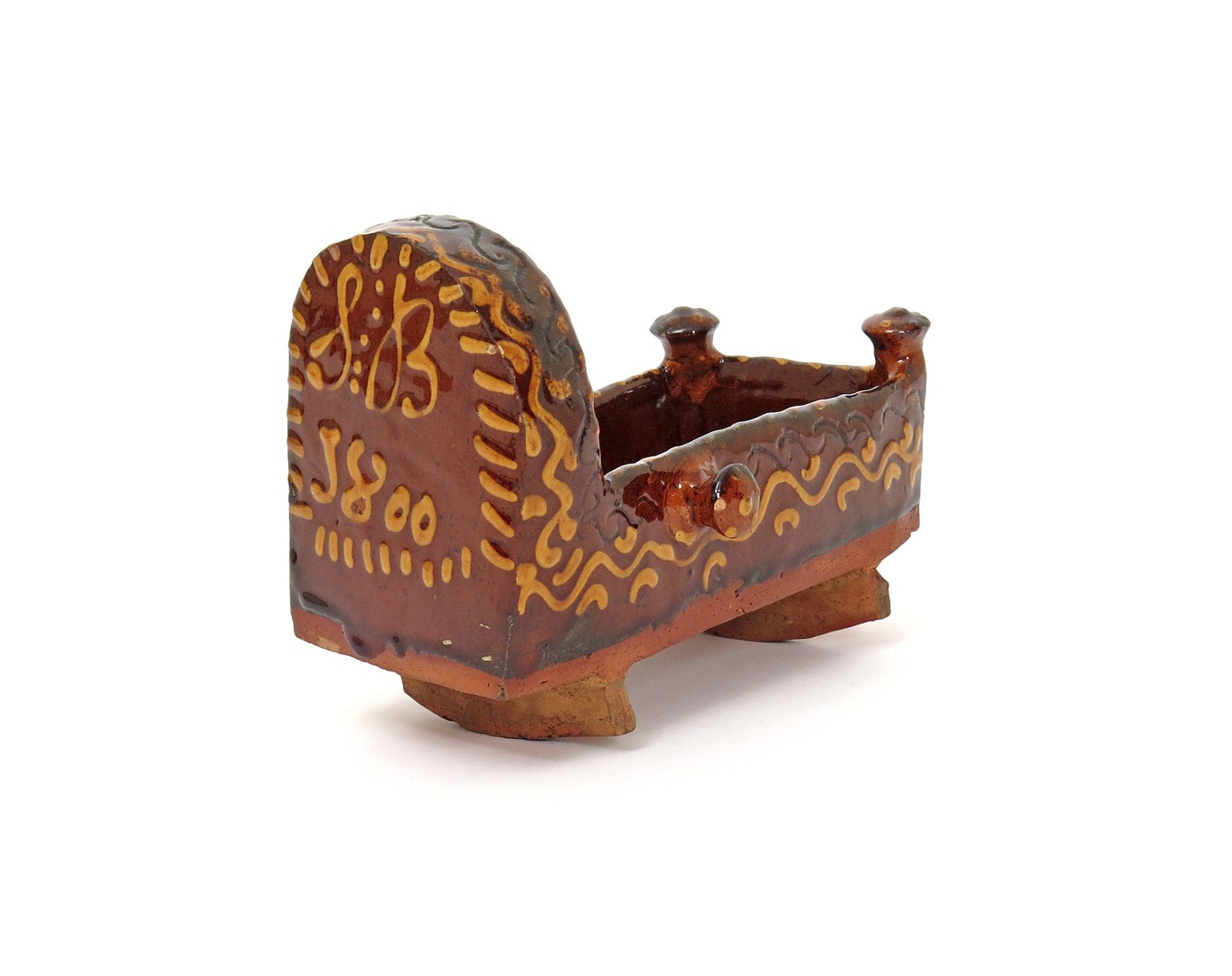 A slipware model of a cradle dated 1800, incised and decorated in cream slip with continuous scrolls and dashes, the cradle's head inscribed with the initials SB and the date 1800, all on a treacle ground, a chip to one rocker, 19cm across.