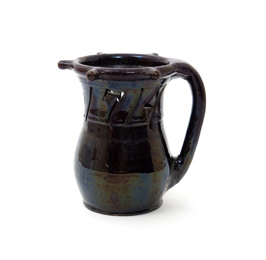 A slipware puzzle jug dated 1714