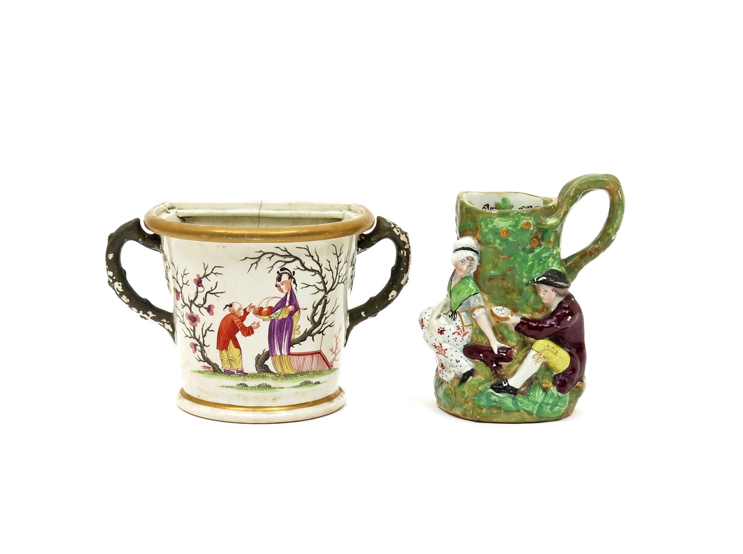 A small pearlware Fair Hebe jug early 19th century, modelled with two figures and a bird's nest, and a Davenport pearlware bough pot, painted in polychrome enamels with two Chinese figures beneath bare trees, the cover lacking, cracked, 13cm max. (2)