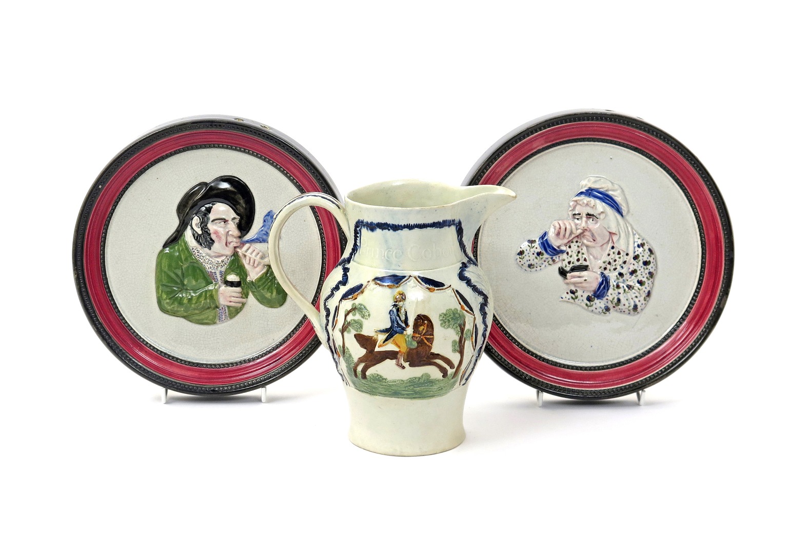 A Pratt ware commemorative jug c.1795, moulded to two sides with an equestrian portrait, one titled 'Duke of York' the other 'Prince Cobourg', and a pair of pearlware circular wall plaques, decorated in raised relief and Portobello colours with a smoking miser and a female snuff-taker within beaded borders, 21.5cm max. (3)
