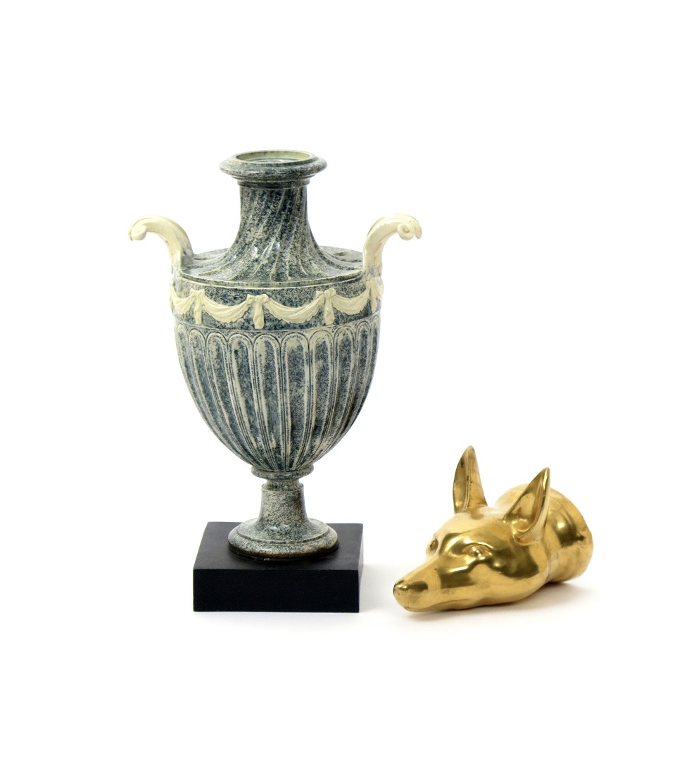 A Wedgwood & Bentley variegated creamware vase c.1775, the fluted form speckled in a deep blue, the shoulder applied with swags beneath the foliate scroll handles, raised on a square basalt base, applied mark, and a pearlware stirrup cup in the form of a fox's head, richly decorated in allover gilt, the vase's cover lacking, one ear of the stirrup cup repaired, 26.5cm max. (2)
