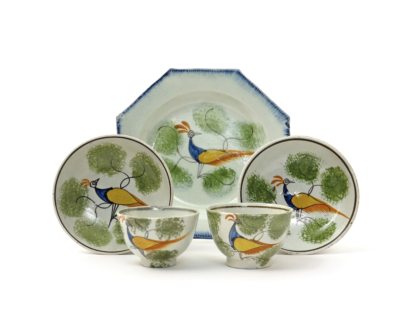 A pair of pearlware 'Peafowl' toy teabowls and saucers 1st half 19th century, and a child's octagonal plate, all decorated in Pratt colours with a Spartacus bird perched amidst sponged green foliage, a few small chips, 15cm max. (5)