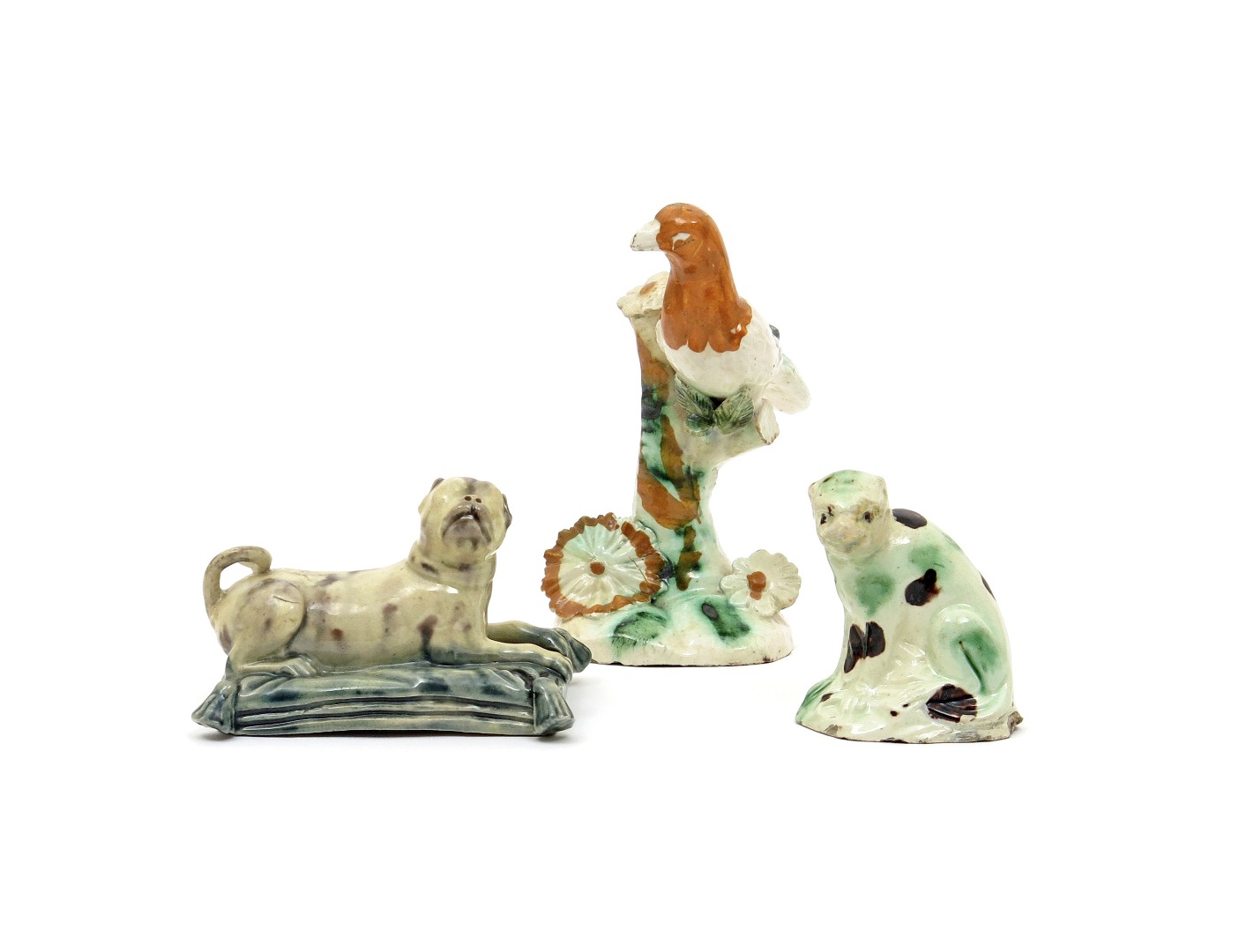 Three creamware models of animals late 18th/early 19th century, one of a pug recumbent on a blue tasselled cushion, its head turned to dexter, one of a monkey seated on its haunches and decorated with green and manganese splashes, the last of a bird perched on a flowering stump, decorated in green and ochre, small damages, 12.2cm max. (3)