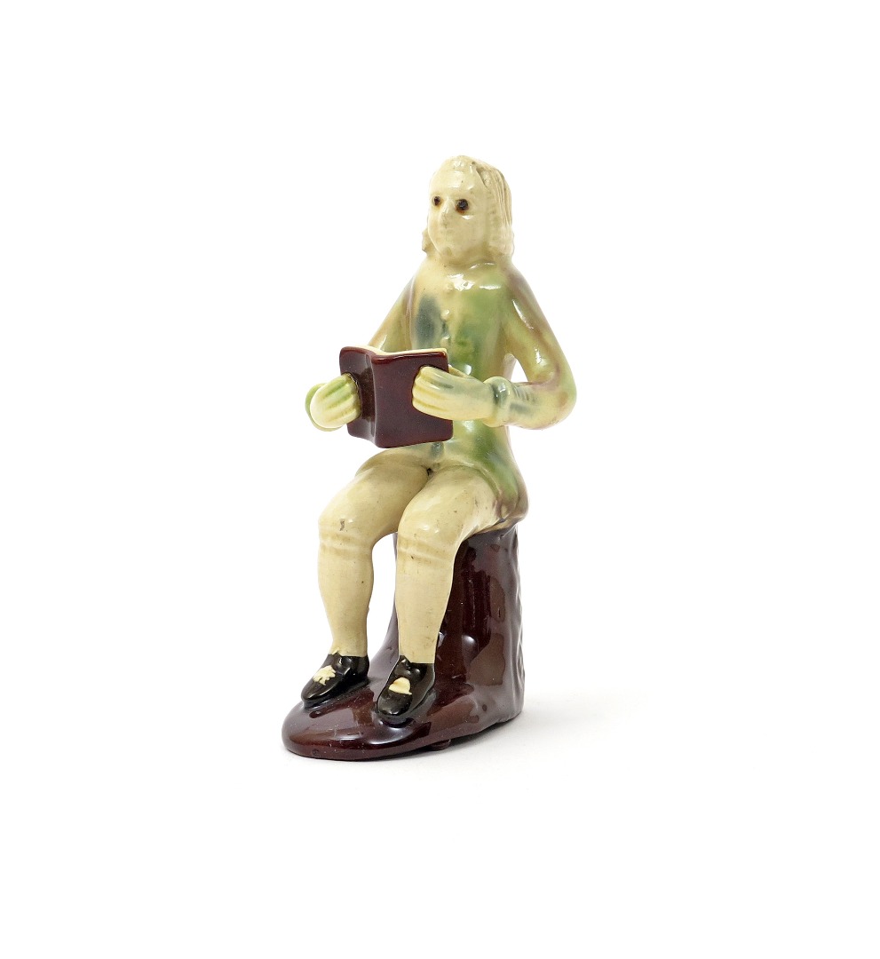 An Astbury / Whieldon type creamware figure of a musician perhaps mid 18th century, seated and singing from a book, decorated with streaked underglaze colours and on a brown base, some good restoration, 12.5cm.