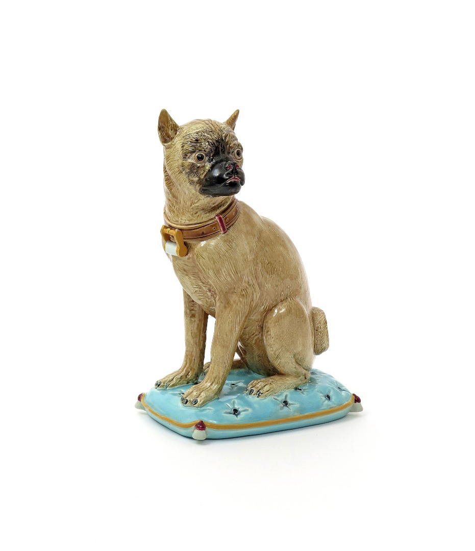 A Joseph Holdcroft Majolica model of a pug dog 2nd half 19th century, seated on a blue studded cushion, with head turned to sinister, wearing a brown leather collar, a little good restoration to the ears, 28.8cm.