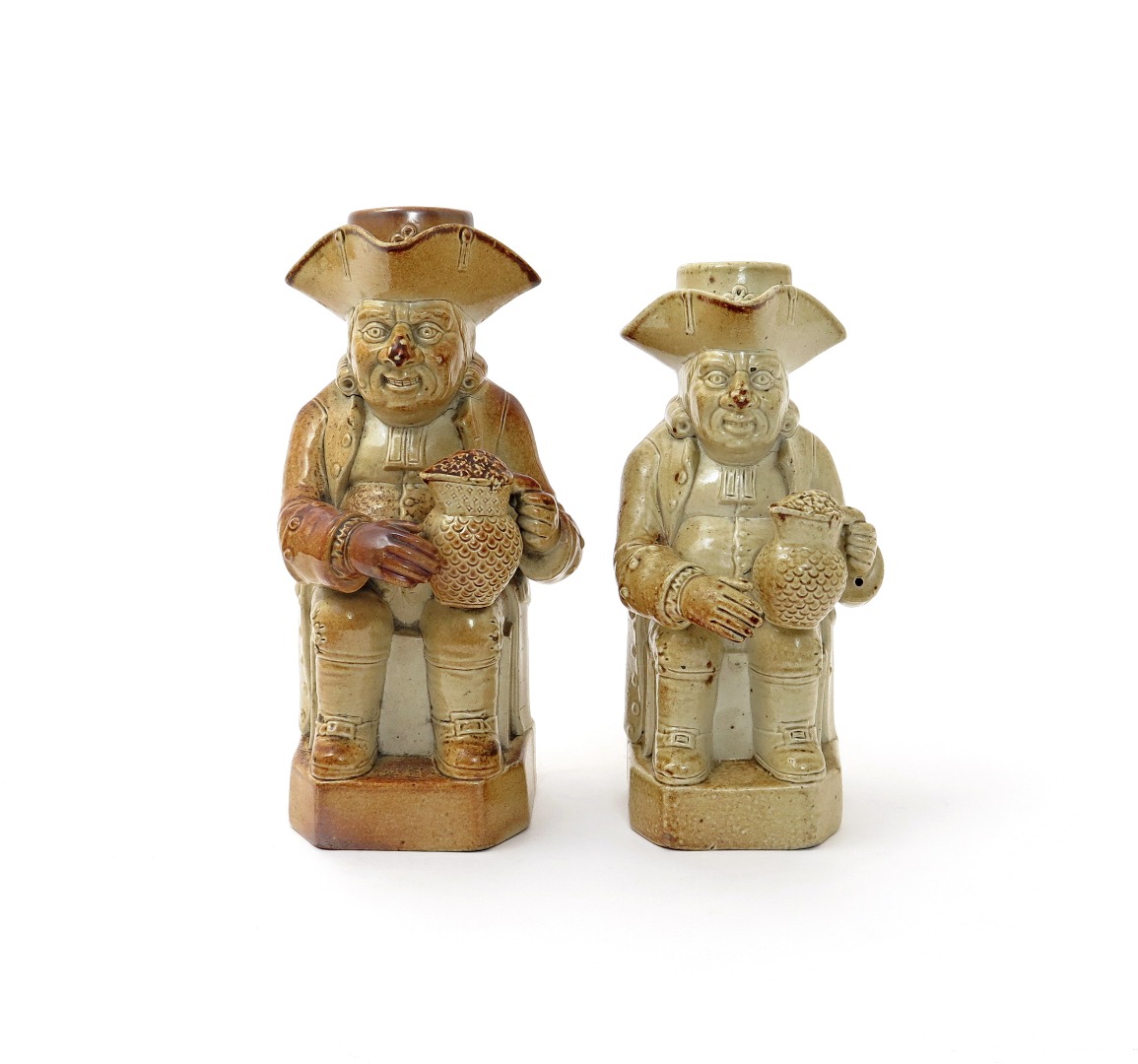 Two brown stoneware Toby jugs with stoppers 19th century, perhaps Derby, each seated with a scale-decorated jug of ale, their large noses moulded with warts, minor faults and restoration, 26.5cm max. (4)
