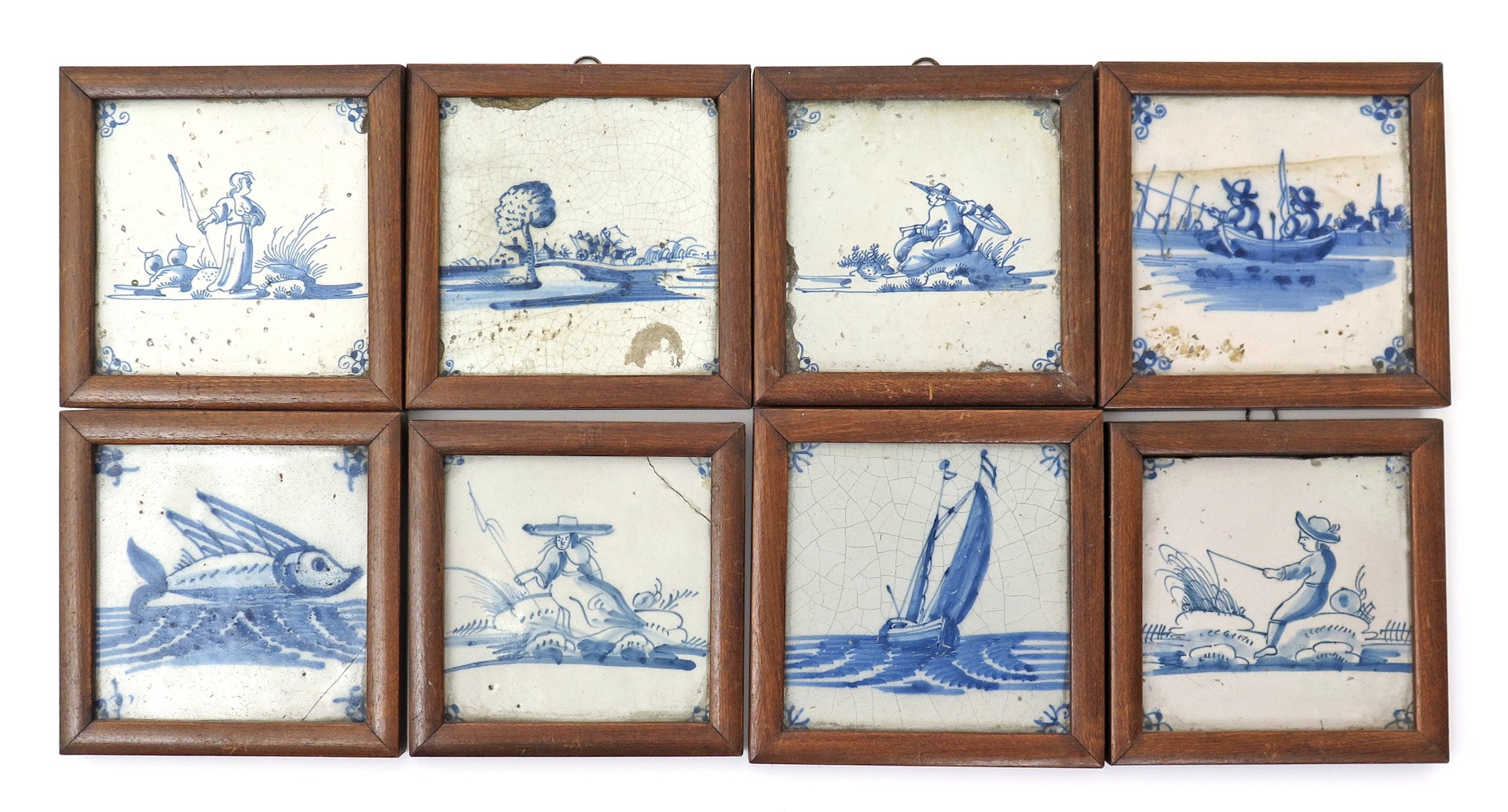 Eight Delft tiles 18th century, painted in blue with various scenes of figures depicted in boats, driving cattle, fishing and seated in landscapes, one decorated with a sailing boat, and another a large fish, all mounted in plain wooden frames, some damages, 15cm overall. (8)