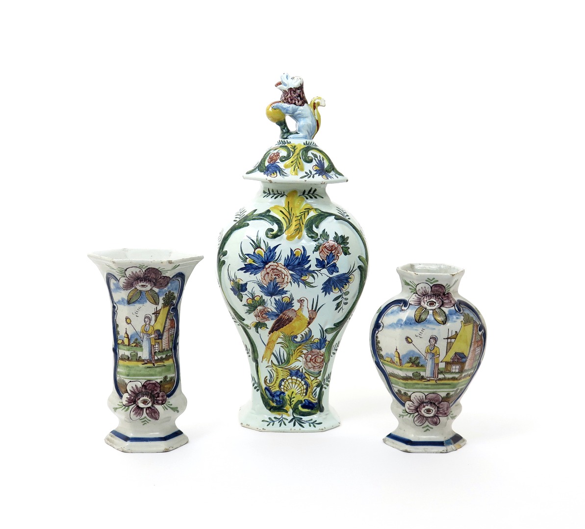A large Delft vase and cover 19th century, brightly painted with a bird perched among flowering branches, the cover surmounted with a lion finial, and two Delft vases from a garniture, one flared, the other baluster, each painted with a female figure holding a mop and bucket, some damages, 46cm max. (4)