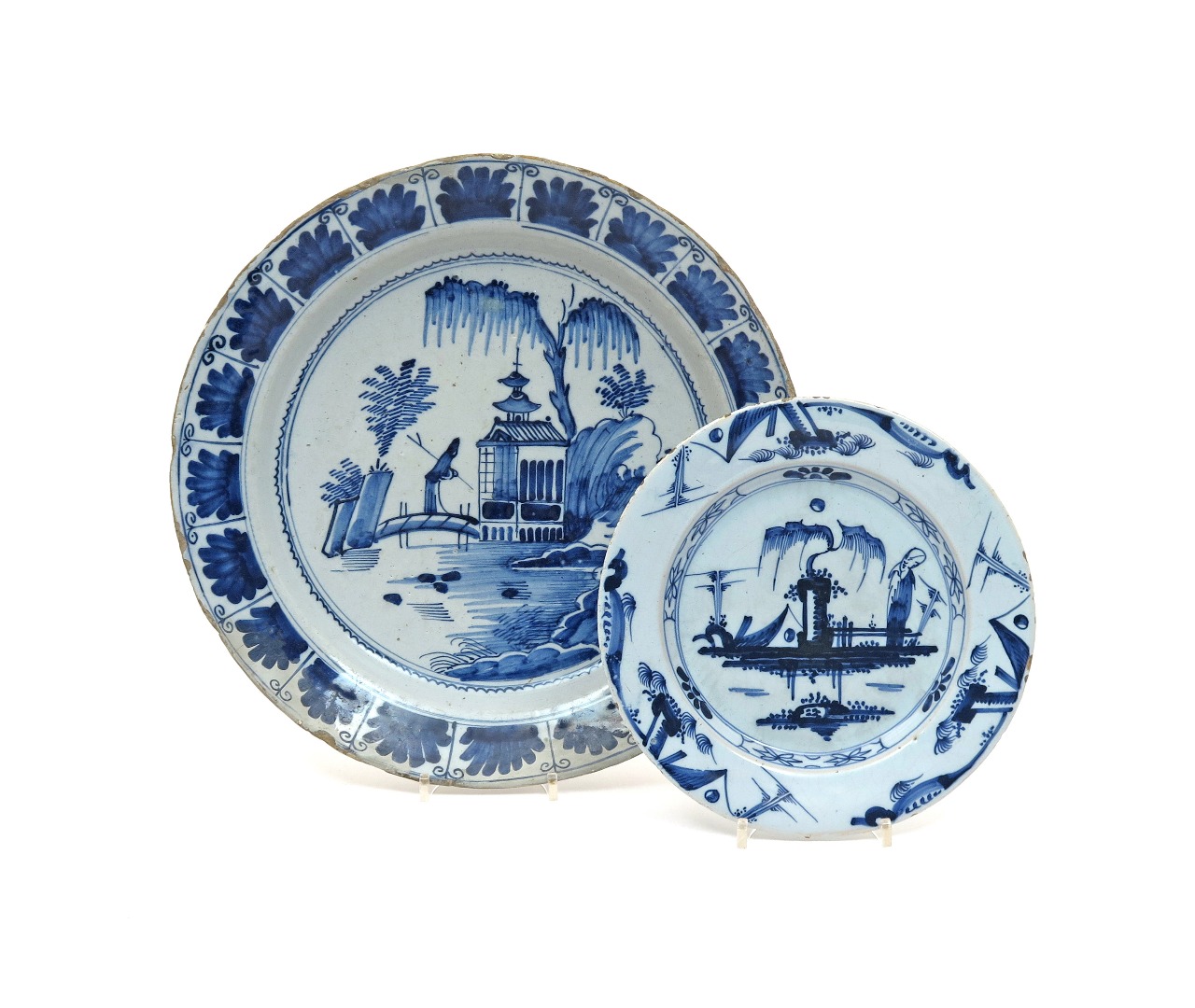 An English delftware plate c.1750, painted in blue with a tall Chinaman standing beside weeping willow, floral panels to the cavetto and further willow vignettes to the rim, and a Delft charger painted with a figure crossing a bridge in a pagoda landscape, the rim with a band of palmettes, some restoration to the latter, 34.5cm max. (2)