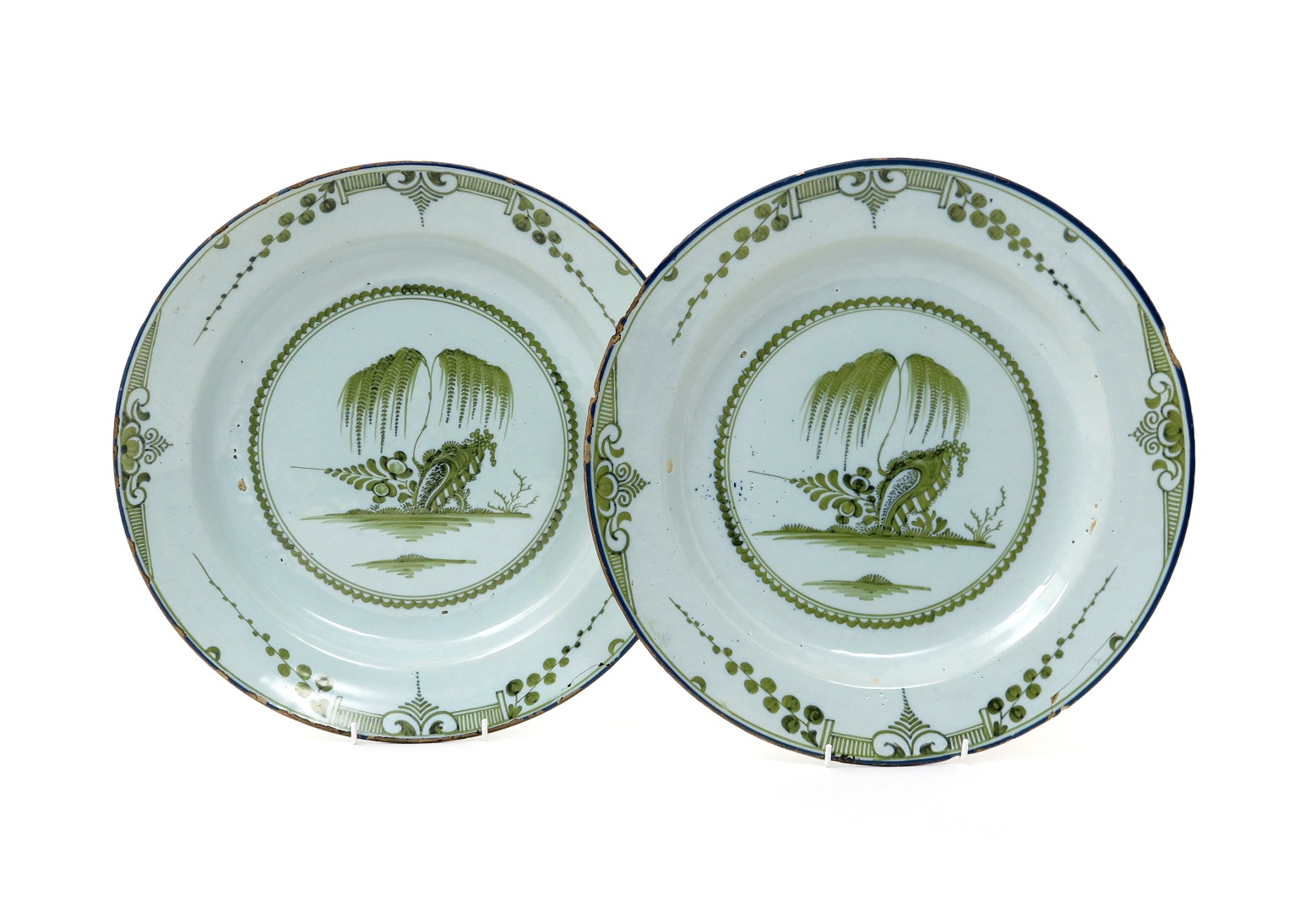 A pair of English delftware chargers mid 18th century, each decorated in green monochrome with weeping willow issuing from stylized rockwork, the rims with four foliate motifs within a blue line border, minor damages, 34.8cm. (2)