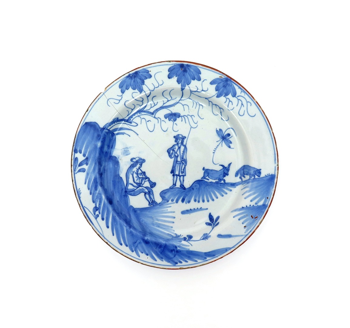A Liverpool delftware plate c.1760-80, painted in blue with a seated figure playing the flageolet while a shepherd and two of his charges stand nearby, the upper rim with leafy branches issuing from the rocky precipice above the musician's head, 12cm rim crack, 22.2cm.