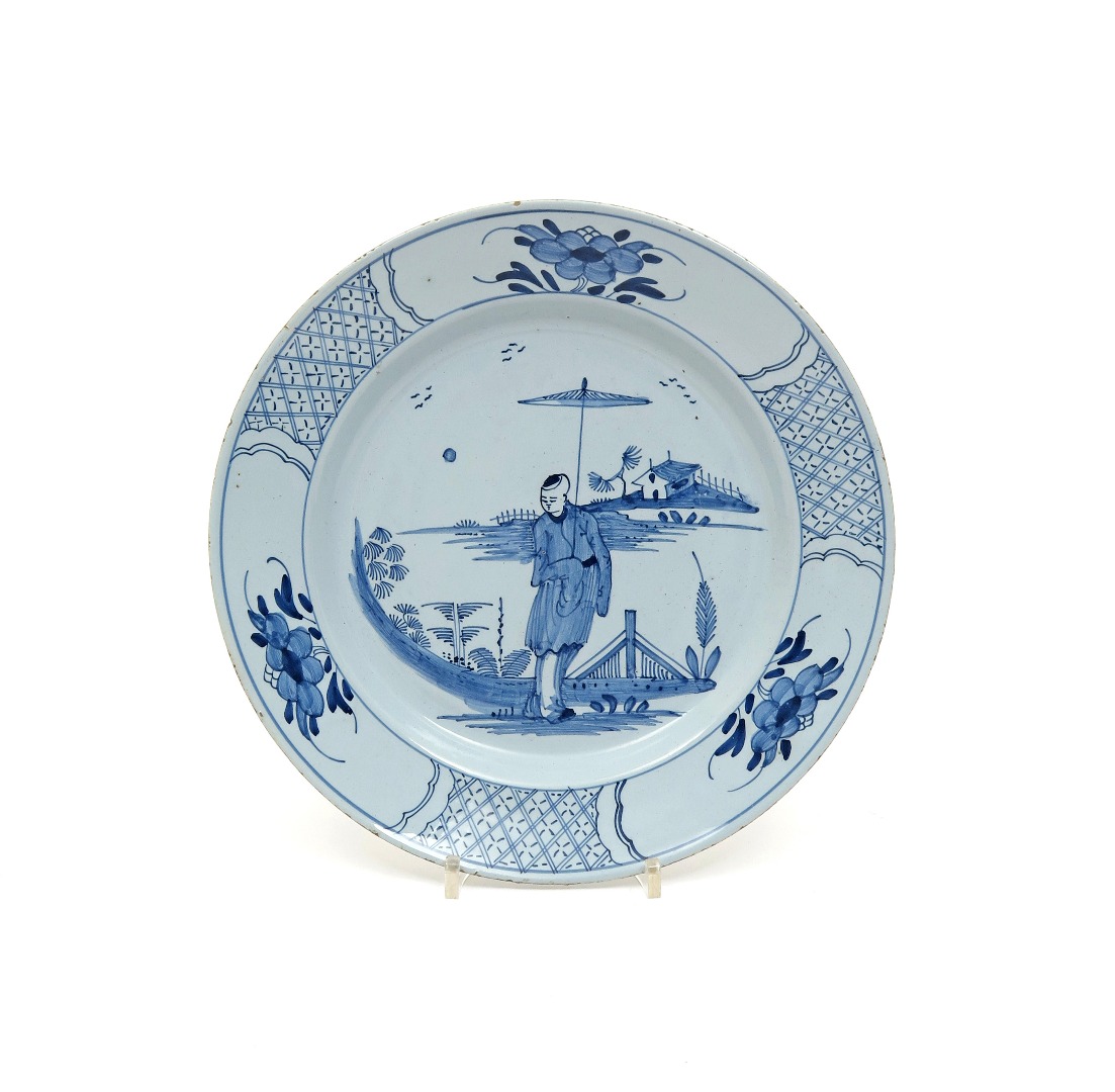 A good delftware plate mid 18th century, finely potted and painted in blue with a standing Chinese figure holding a parasol before a low ornamental fence, the rim with three panels of peony on a hatched diaper ground, X and II decoration beneath the rim, 25.2cm.