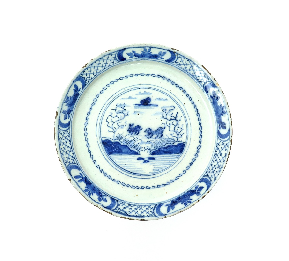 A Delft plate 18th century, the well painted in blue with a rabbit and a dog between bare trees, the rim with five floral panels reserved on a hatched diaper ground, some glaze chipping to the rim, 26.2cm.