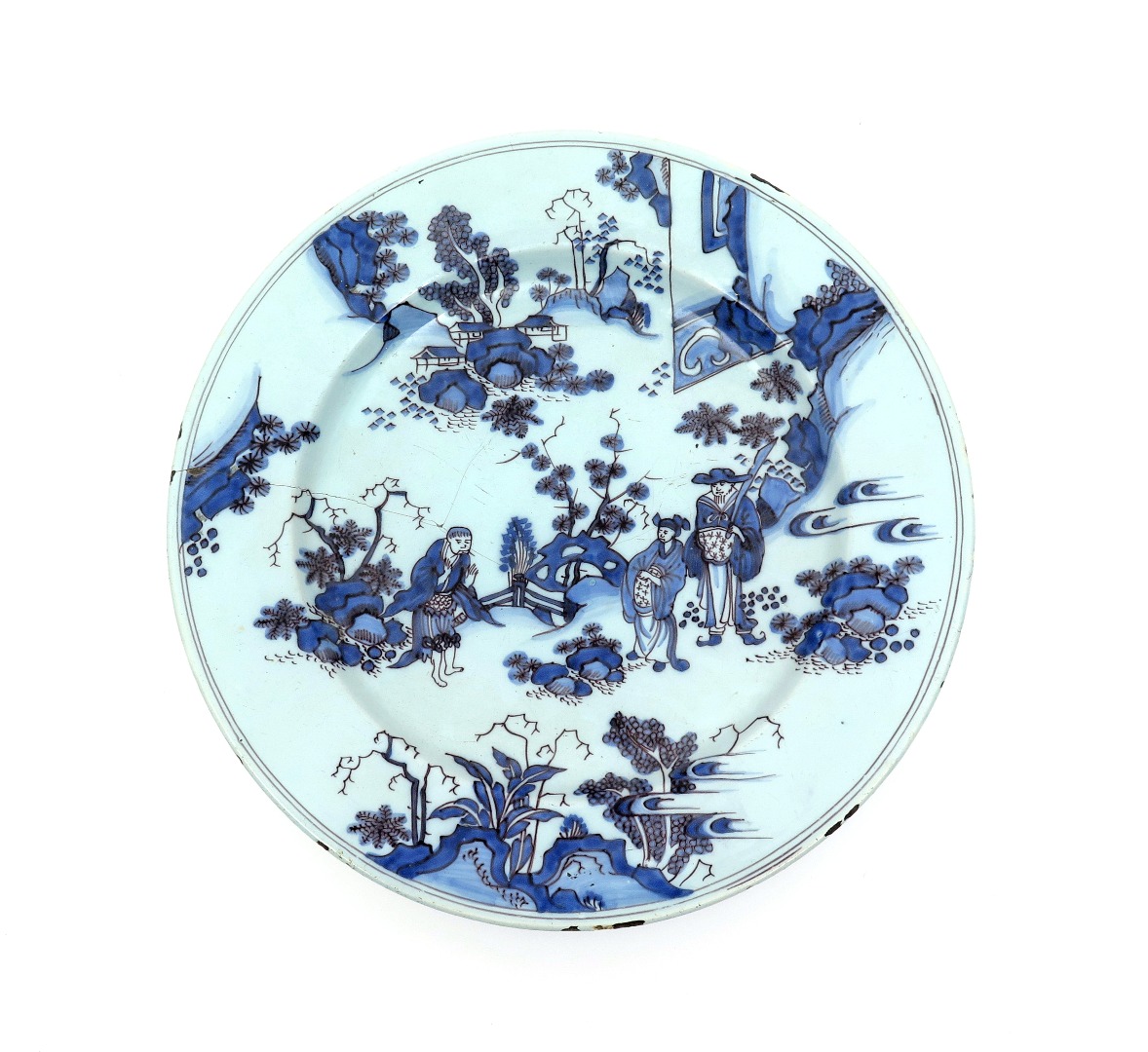 A Frankfurt faïence charger late 17th/early 18th century, painted in blue and manganese with three figures in an extensive Chinese landscape, cracked, 41cm.