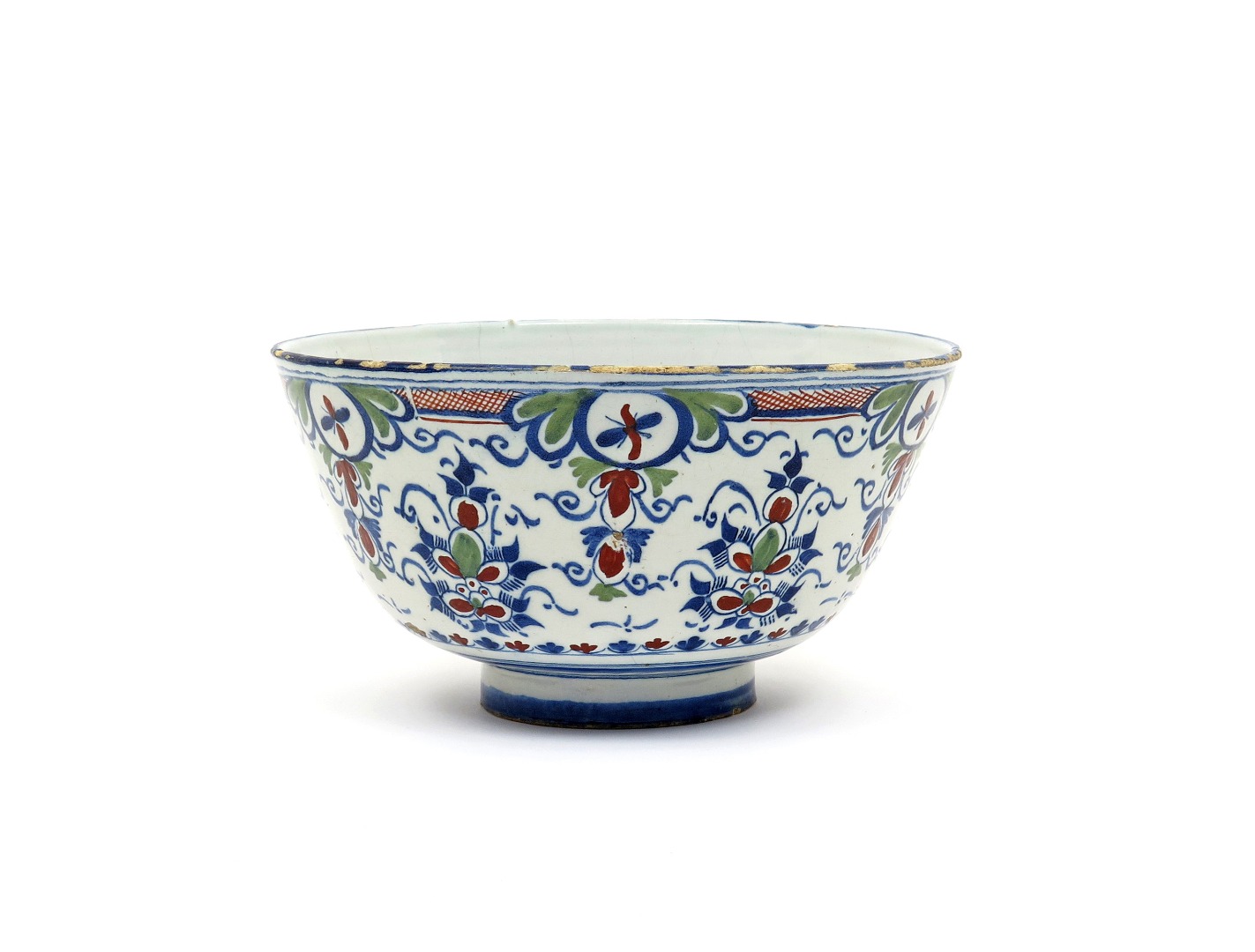 A large delftware bowl c.1725, probably Bristol, the tall sides enamelled in red, green and blue with stylized flower sprays and small roundels beneath a formal border, the interior with a large blue leaf, some rim cracks, 26.5cm dia.
