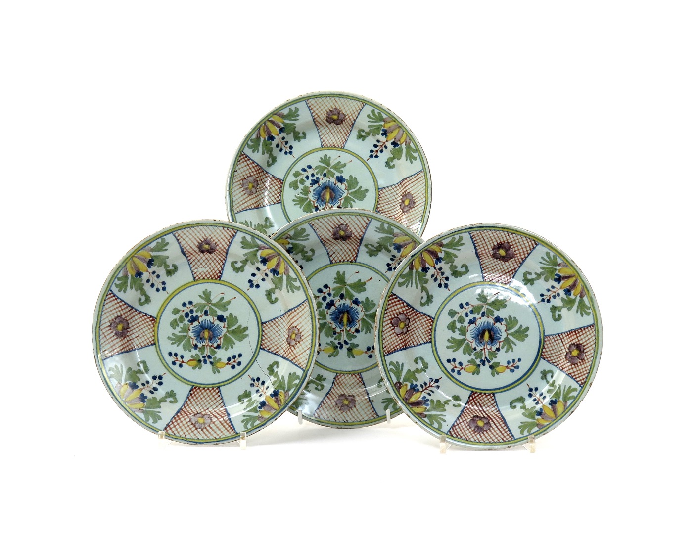 Four delftware plates 18th century, each decorated with a central floral spray within a panelled border of further sprays alternating with single manganese flowerheads reserved on a hatched iron red diaper ground, two cracked, 19.3cm. (4)
