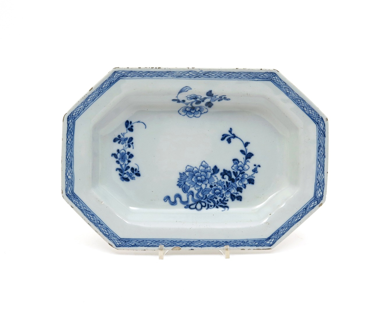 An Irish delftware octagonal dish c.1760, painted in blue with simple sprays of flowering peony within a hatched diaper border, numeral 2 mark to the reverse, a little glaze chipping, 29.8cm.