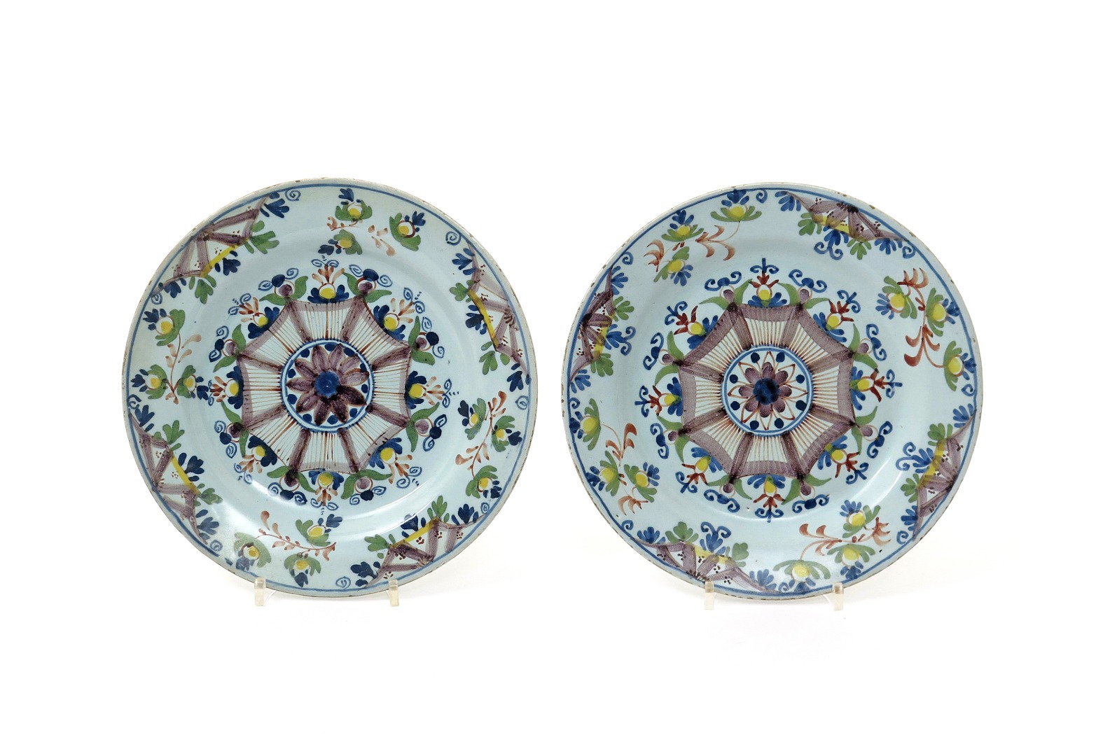 A pair of Lambeth delftware plates late 18th century, of Ann Gomm type, decorated in polychrome enamels with a central octagonal motif within stylized foliate and floral motifs, 22.9cm. (2)