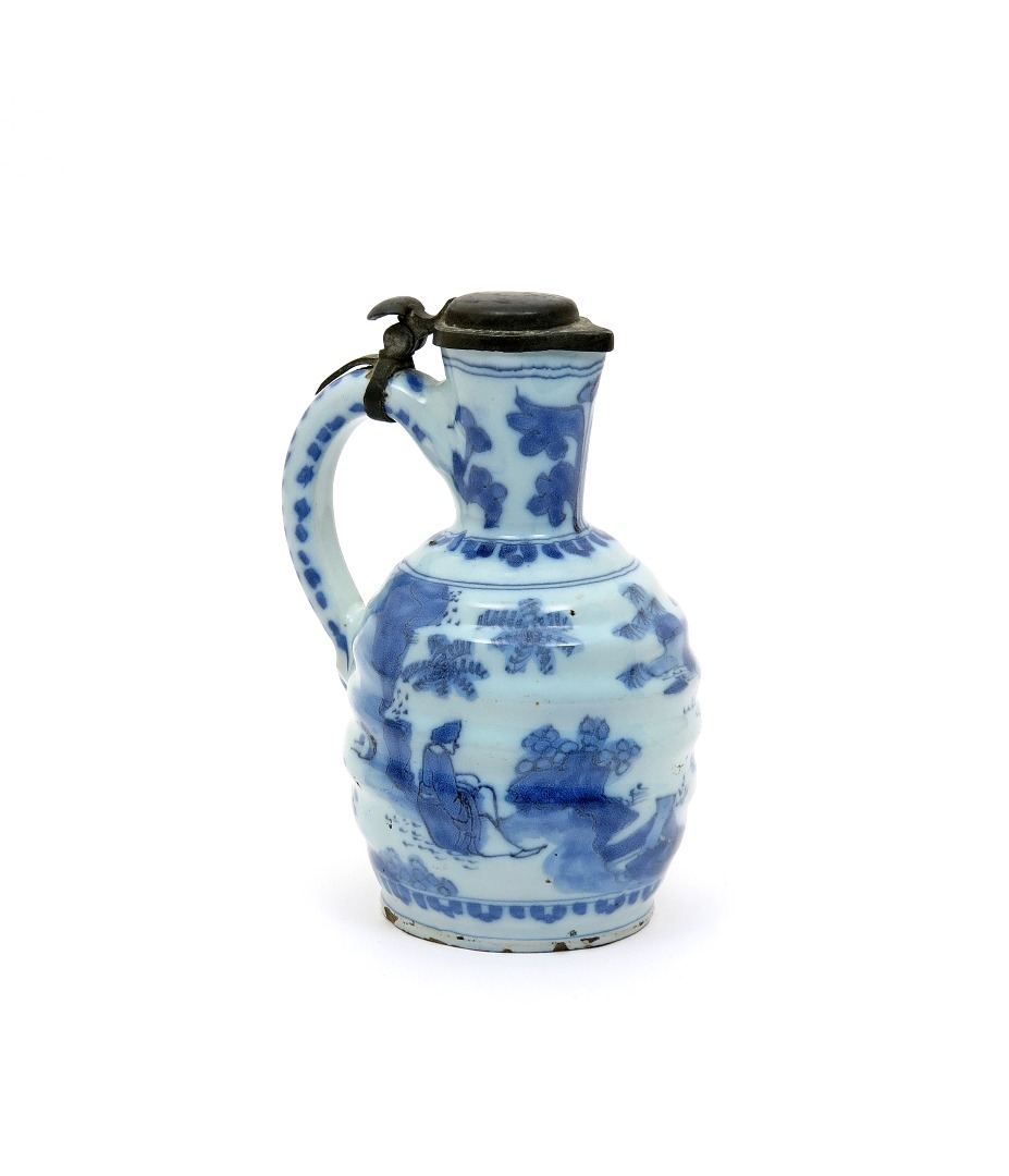 A Frankfurt faïence pewter-mounted jug or ewer early 18th century, moulded with horizontal bands, painted in blue with Chinese figures in a landscape setting, the shoulder and foot with a stiff leaf border, with pewter cover mounted to the handle, minor faults, 20.5cm.