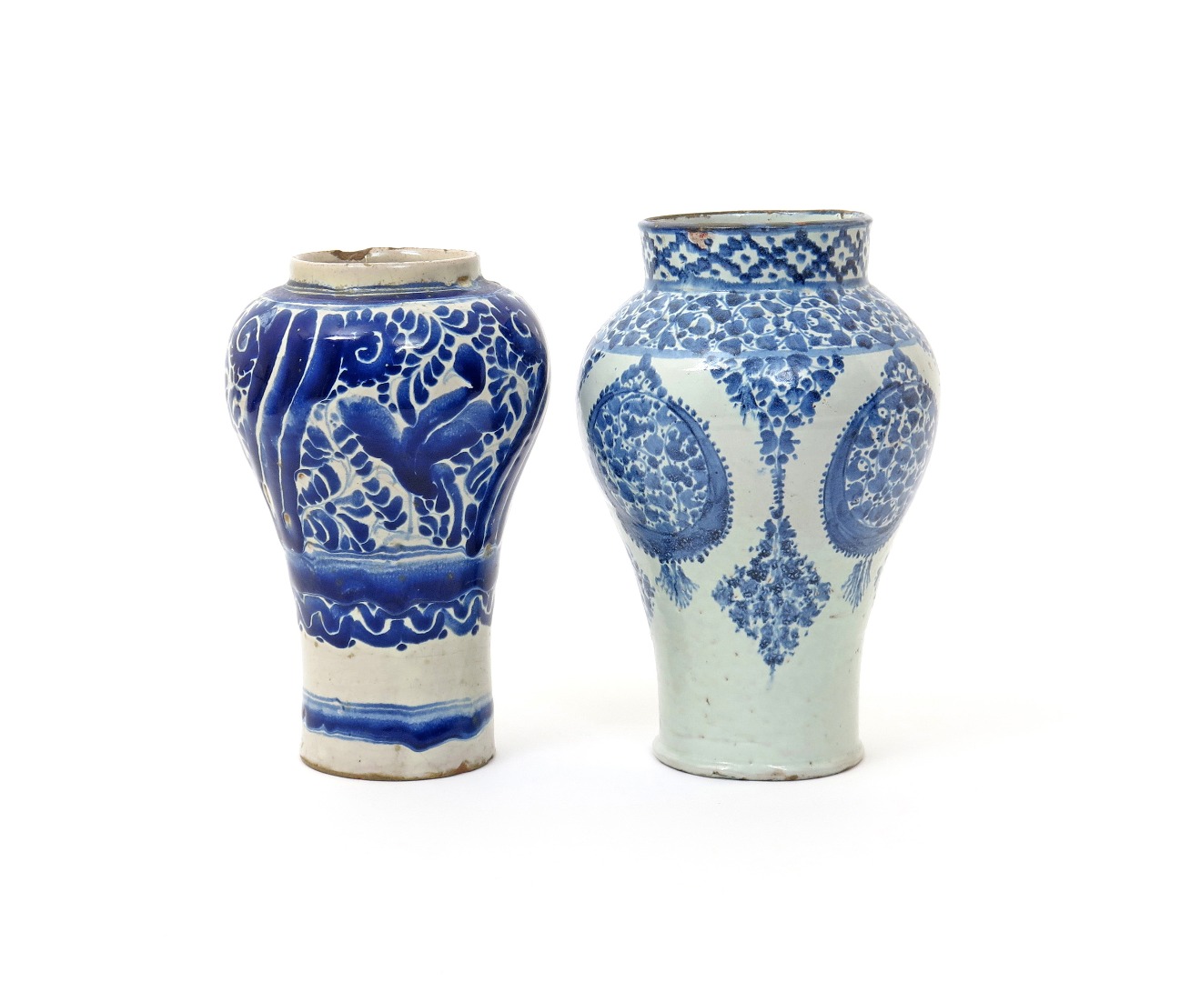Two tin-glazed baluster vases 19th century, one Moroccan pottery and painted in the Islamic style with foliate roundels, the other Mexican Talavera and painted in blue with a bold foliate design, minor damages, 26cm max. (2)
