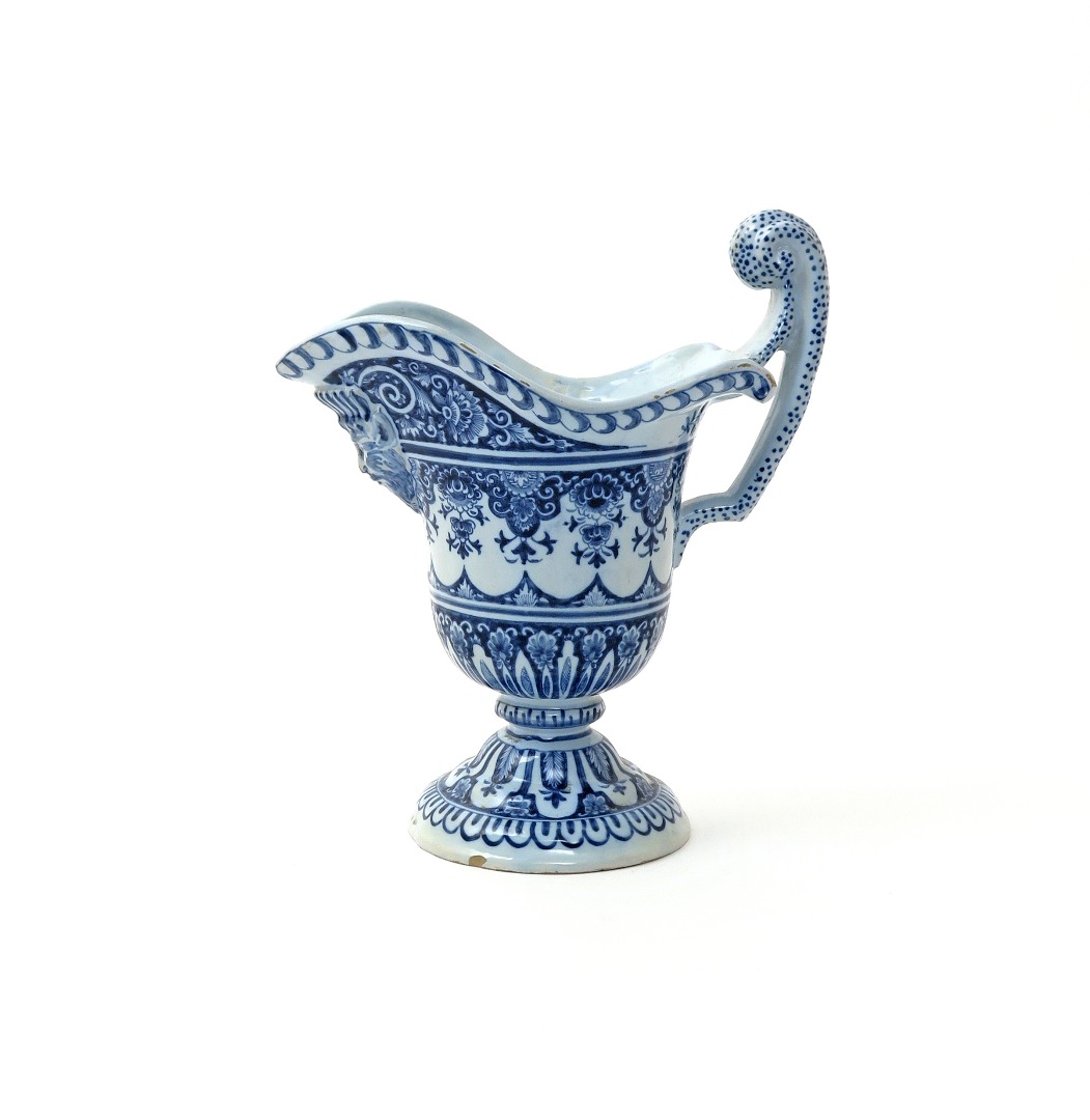 A French faïence ewer probably 18th century Rouen, of helmet shape, decorated in blue with a lambrequin design above a flared foot, the spout moulded with a mythical mask, the tall scrolling handle with a dense pattern of dots, a little glaze chipping, 30cm.