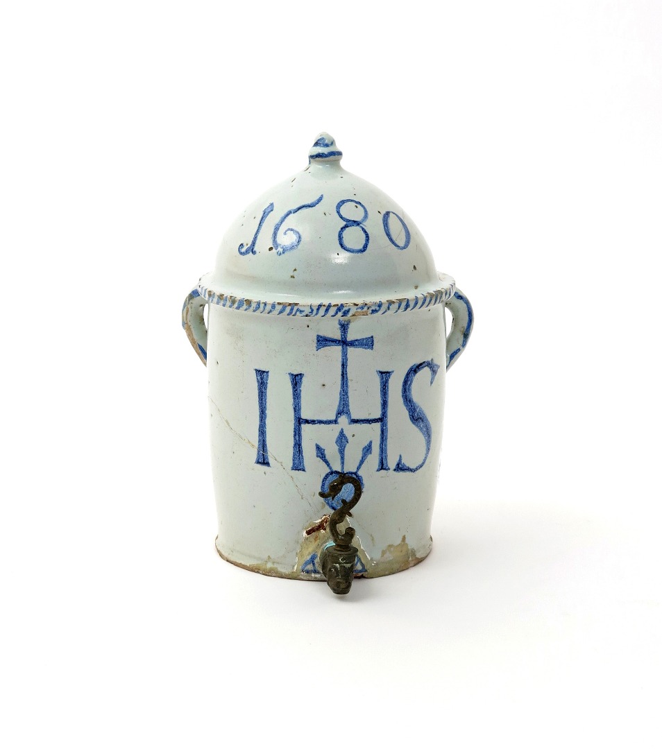 A Delft or faïence water cistern dated 1680, the flattened cylindrical form painted in blue with a Christogram and sacred heart above a later metal tap, the domed top inscribed '1680', damages, 24cm.