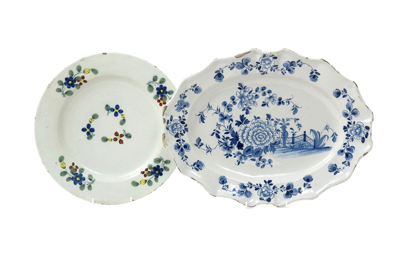 A large English delftware plate mid 18th century, decorated in the Fazackerly palette with simple scattered flower sprays, and a large shaped delftware dish with moulded rim, painted in blue with a vase of flowers beside bold peony sprays, some glaze chipping, 41.5cm max. (2)