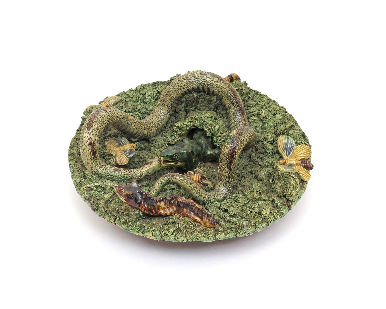 A large Palissy style dish late 19th century, applied with a long snake being bitten by a lizard emerging from a mossy hole, surrounded by a slug, caterpillar, stag beetles and flying insects, impressed mark, 32cm.