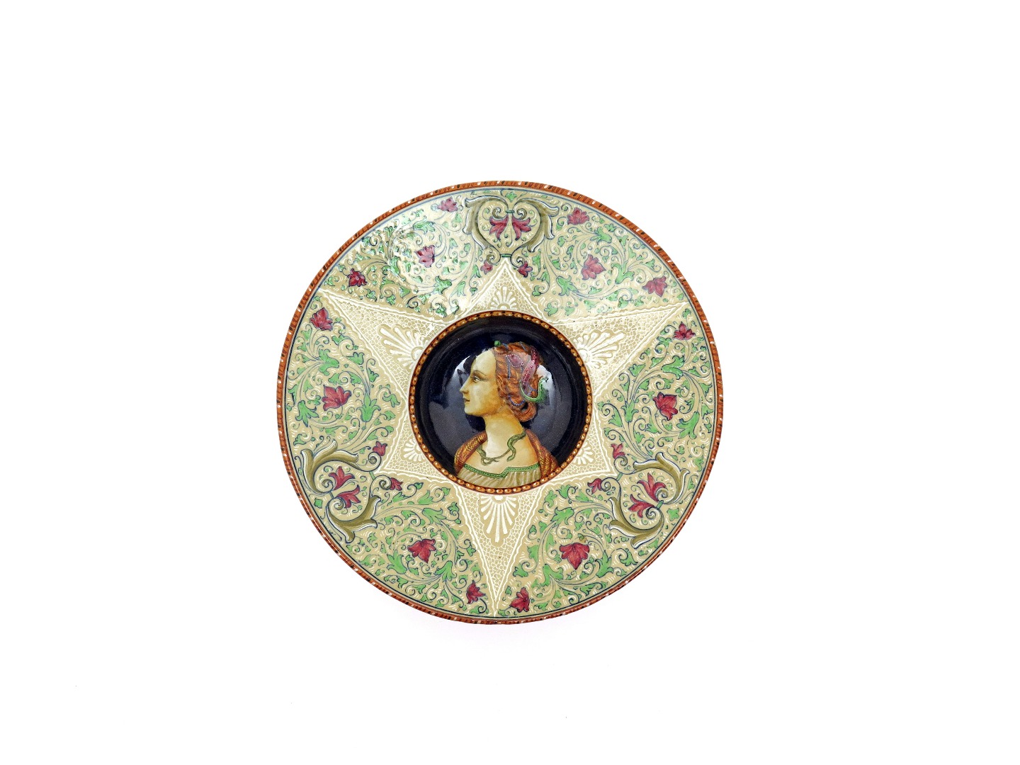 An Italian maiolica portrait dish early 20th century, Vincenzo Molaroni of Pesaro, the deep well painted with the head and shoulders portrait of a young girl wearing a green serpent as a necklace, the wide rim with a continuous foliate design against a buff ground, 26.5cm.