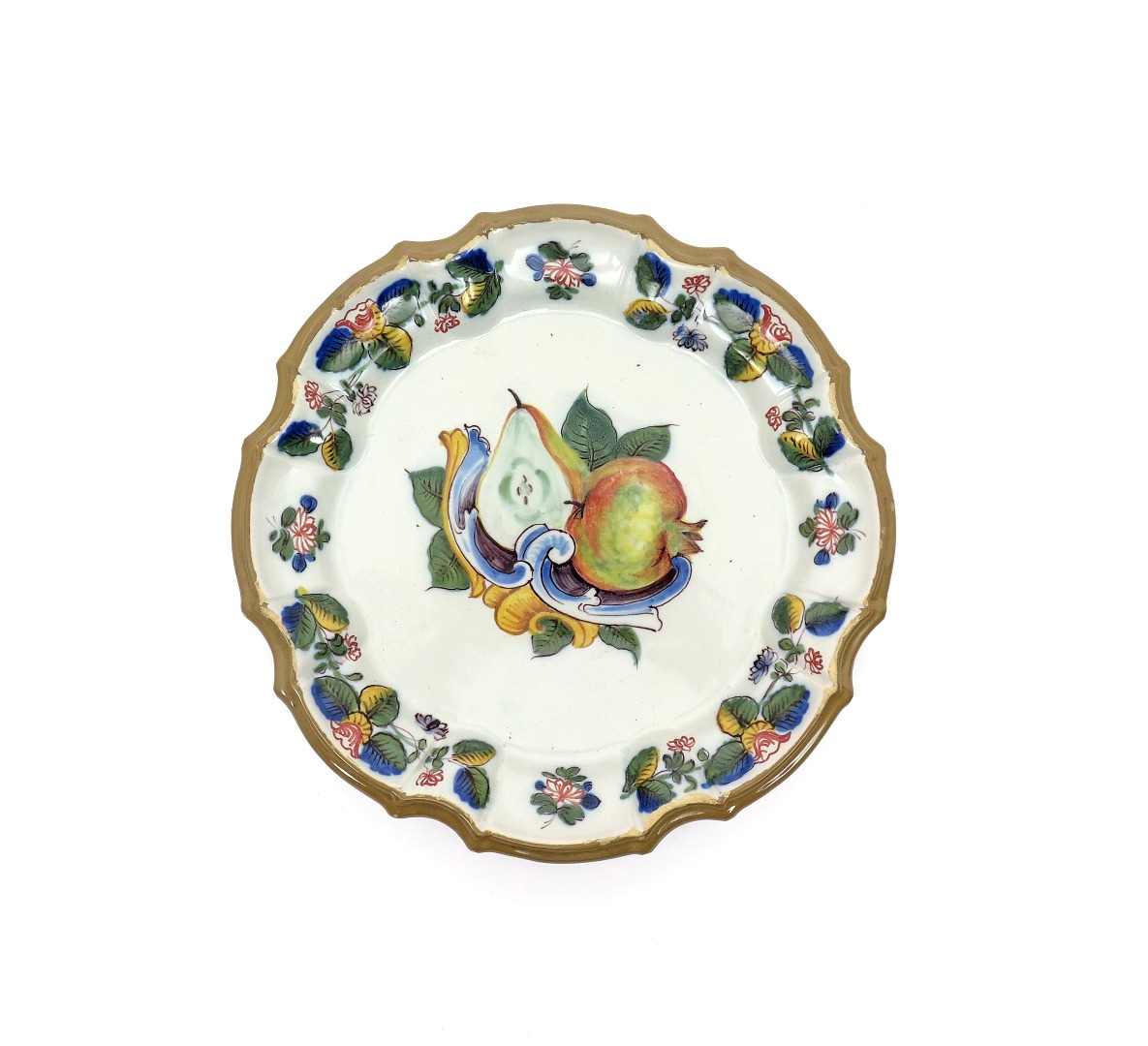 A Nove fruit-decorated dish c.1780, the well painted with a pomegranate and a cut pear above rococo scrolls, the shaped and moulded rim with flower sprays, blue star mark, some glaze chipping, 23.5cm.