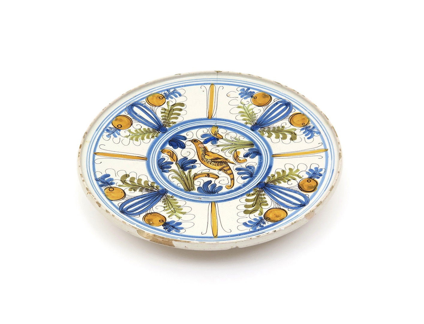 A Deruta maiolica tazza c.1660-80, the circular form painted in blue, green and yellow with manganese detailing, with a bird amidst foliage to the well, the rim with four panels of stylized fruits, raised on a low flared foot, a section broken out and cleanly restuck, 26.5cm.