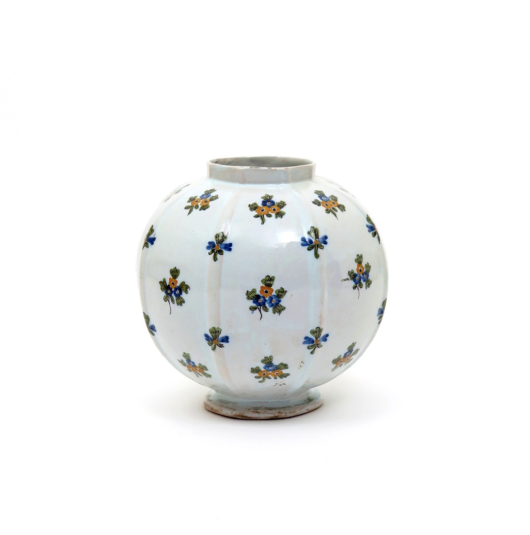A large and unusual Alcora faïence vase or jar c.1745-55, the spherical body moulded with eight vertical ribs, decorated with bands of small floral sprigs in blue, green, ochre and manganese, black A mark, 19.5cm high.
