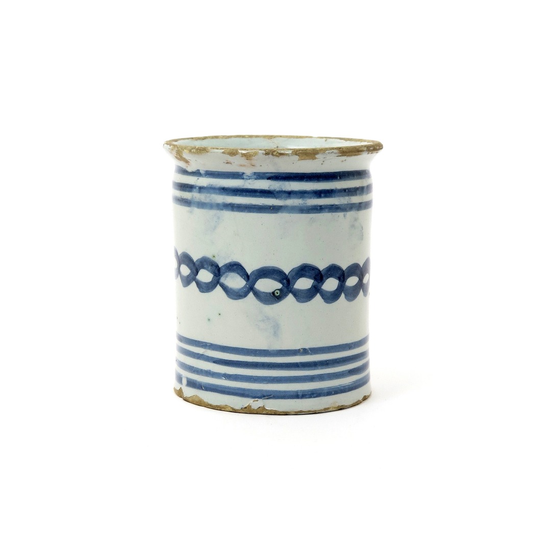 An English delftware apothecary jar 18th century, probably London, the cylindrical body painted in blue with horizontal bands and a band of chain, some chipping to the rim, 14.2cm.