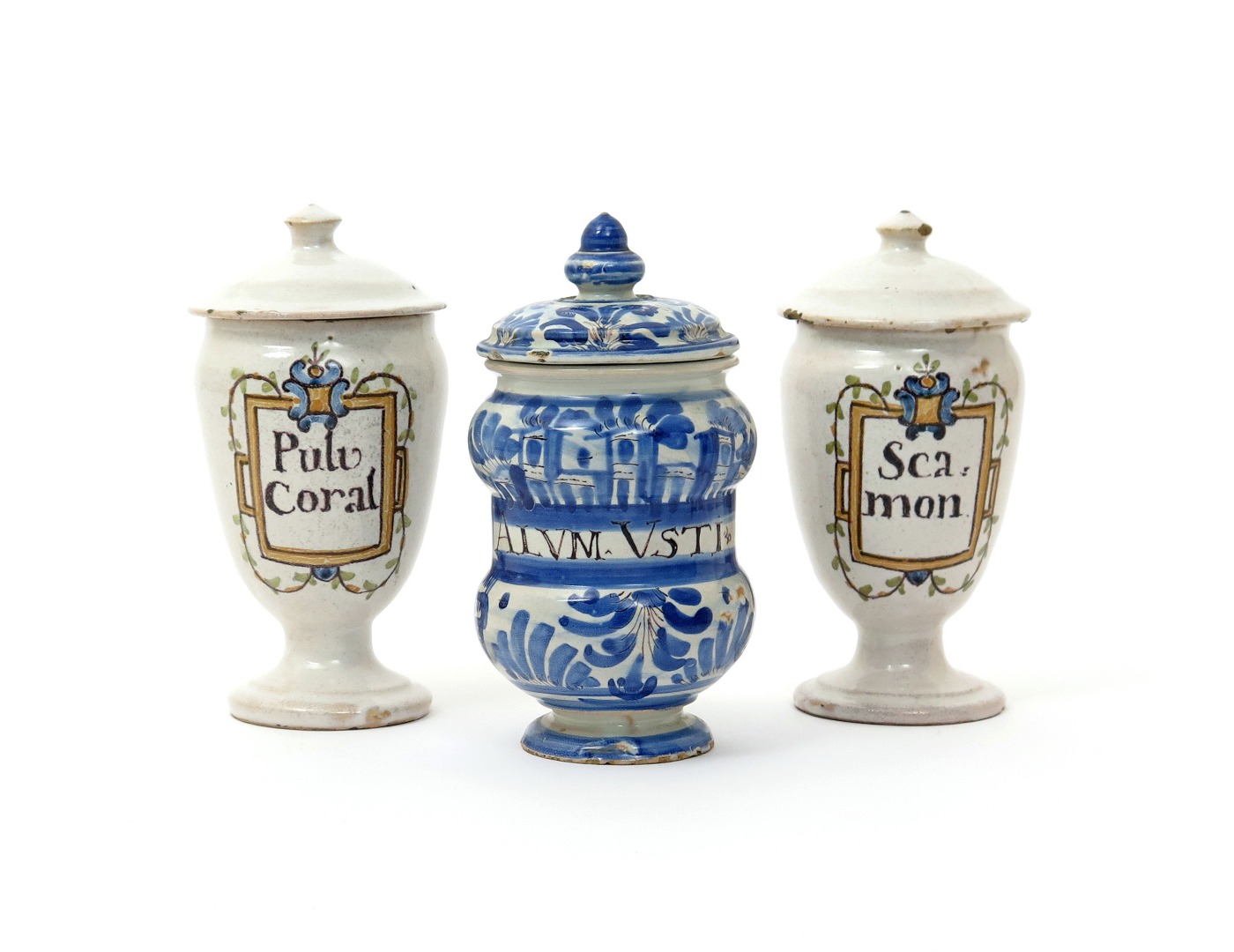 A pair of small Italian maiolica drug jars and covers c.1760, the baluster forms raised on circular feet, inscribed 'Pulv Coral' and 'Scamon' respectively, and a North Italian maiolica jar and cover, inscribed ' Alum Usti' and painted in blue with simple buildings and trees, 16.5cm max. (6)