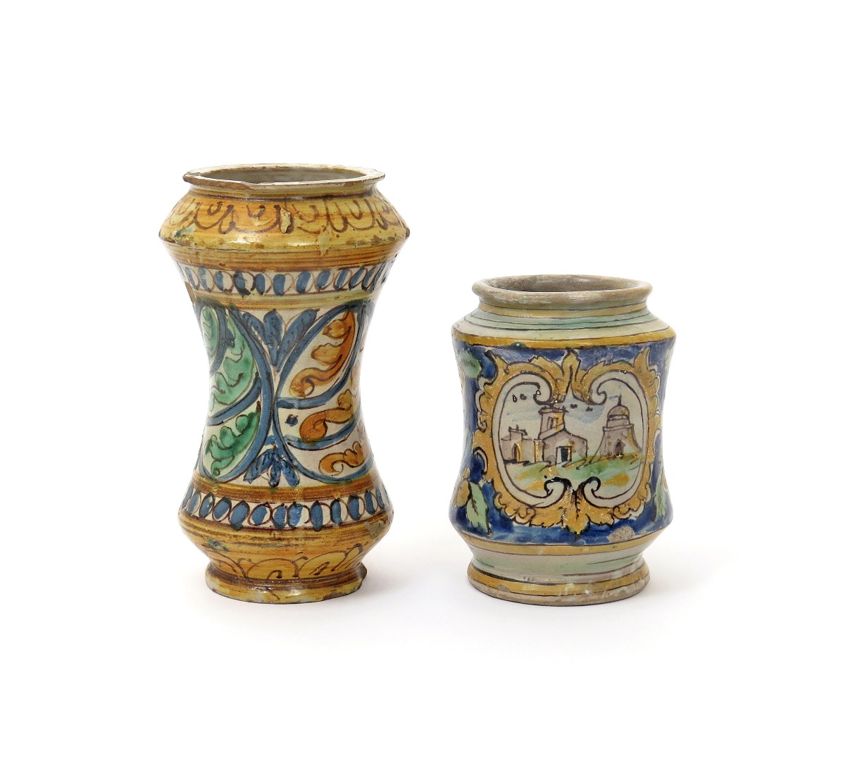 Two Sicilian (Caltagirone) maiolica albarelli late 17th/18th century, one of squat form and painted with a cartouche of buildings within typical green and yellow flowers on a blue ground, the other tall and waisted, decorated with oval panels of stylized leaves, some damages and restoration, 25cm max. (2)