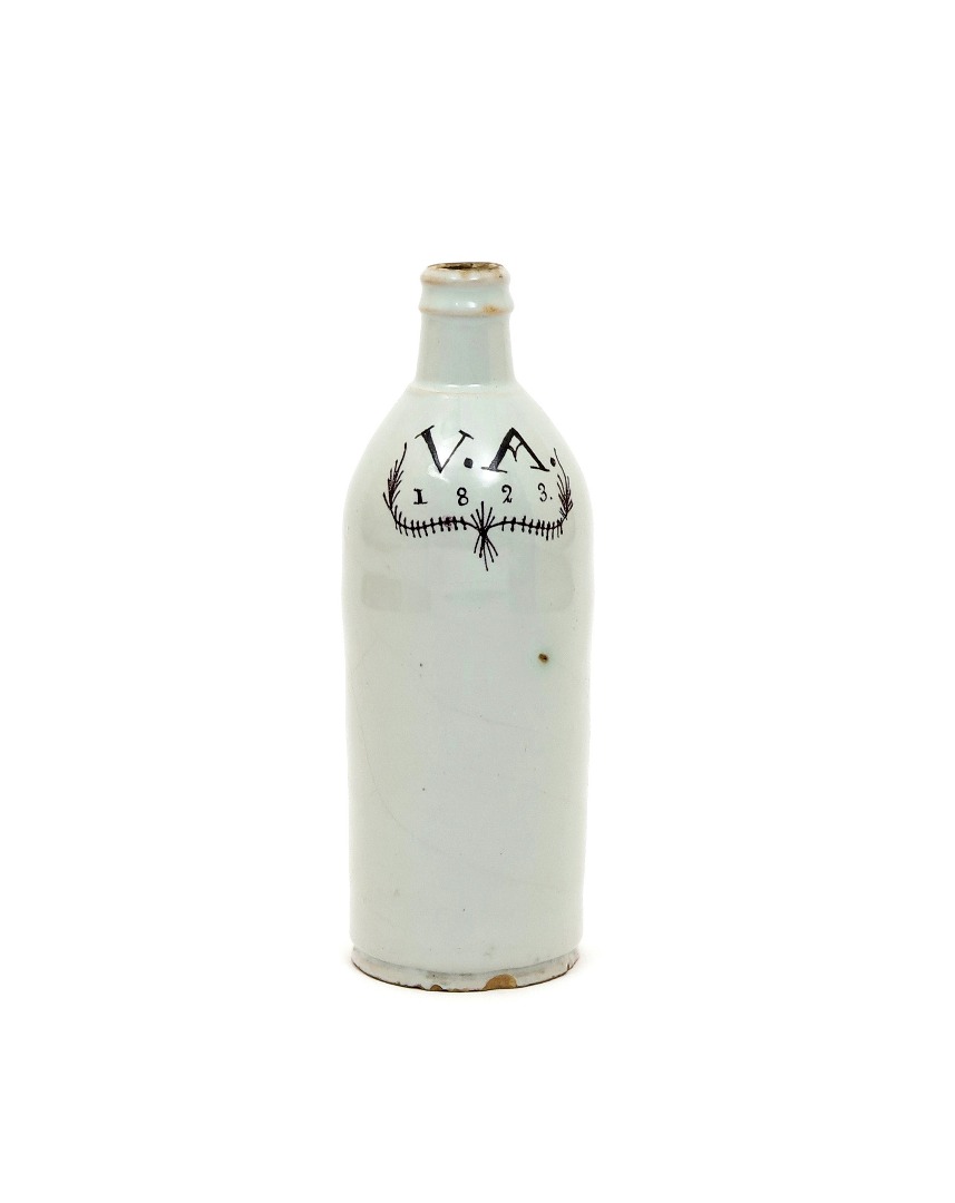 A Continental tin-glazed flagon dated 1823, of straight-sided bottle form with a small strap handle, inscribed in manganese with the initials VA and the date 1823 above a simple foliate motif, a long crack, 24.3cm.