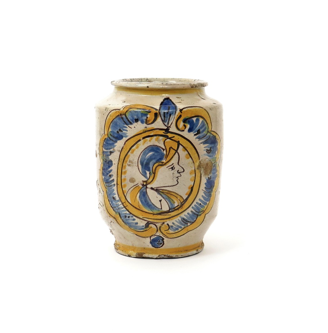 A Sicilian (Caltagirone) maiolica albarello dated 1784, painted to one side with the profile portrait of a soldier, within a scrolled border in blue, ochre and manganese, the reverse inscribed '1784', the base drilled and repaired, 23.2cm.