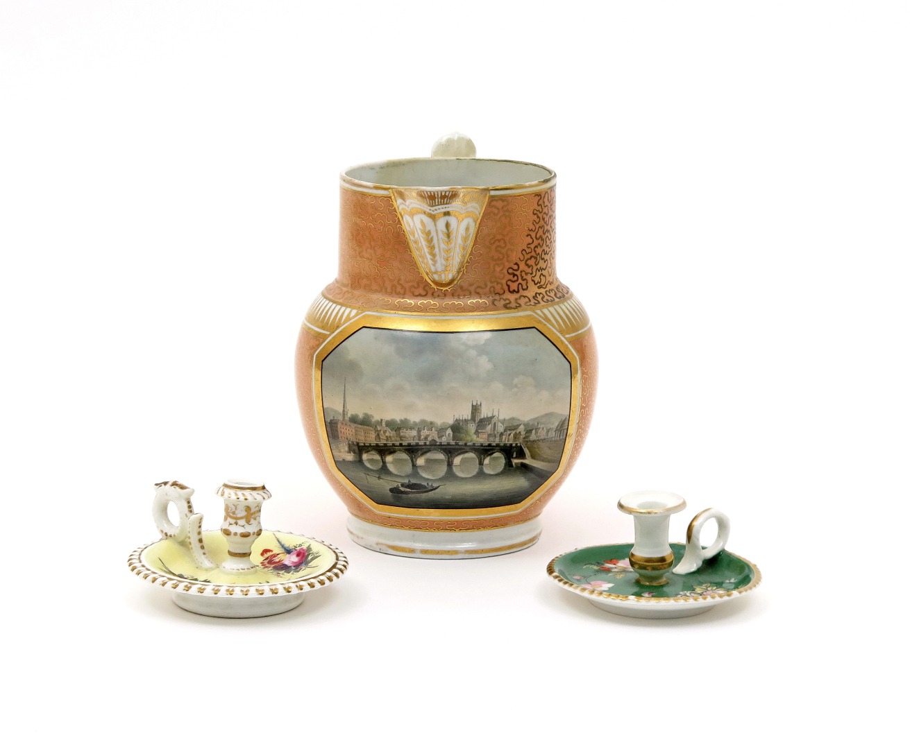 A Chamberlain's Worcester jug c.1815, painted with an octagonal panel containing a view of the bridge at Worcester, reserved on a salmon pink vermicelli ground, a Grainger's Worcester taperstick painted with flowers on a pale yellow ground, and a Spode taperstick similarly decorated on a dark green ground, some restoration to the jug, 16.2cm max. (3)