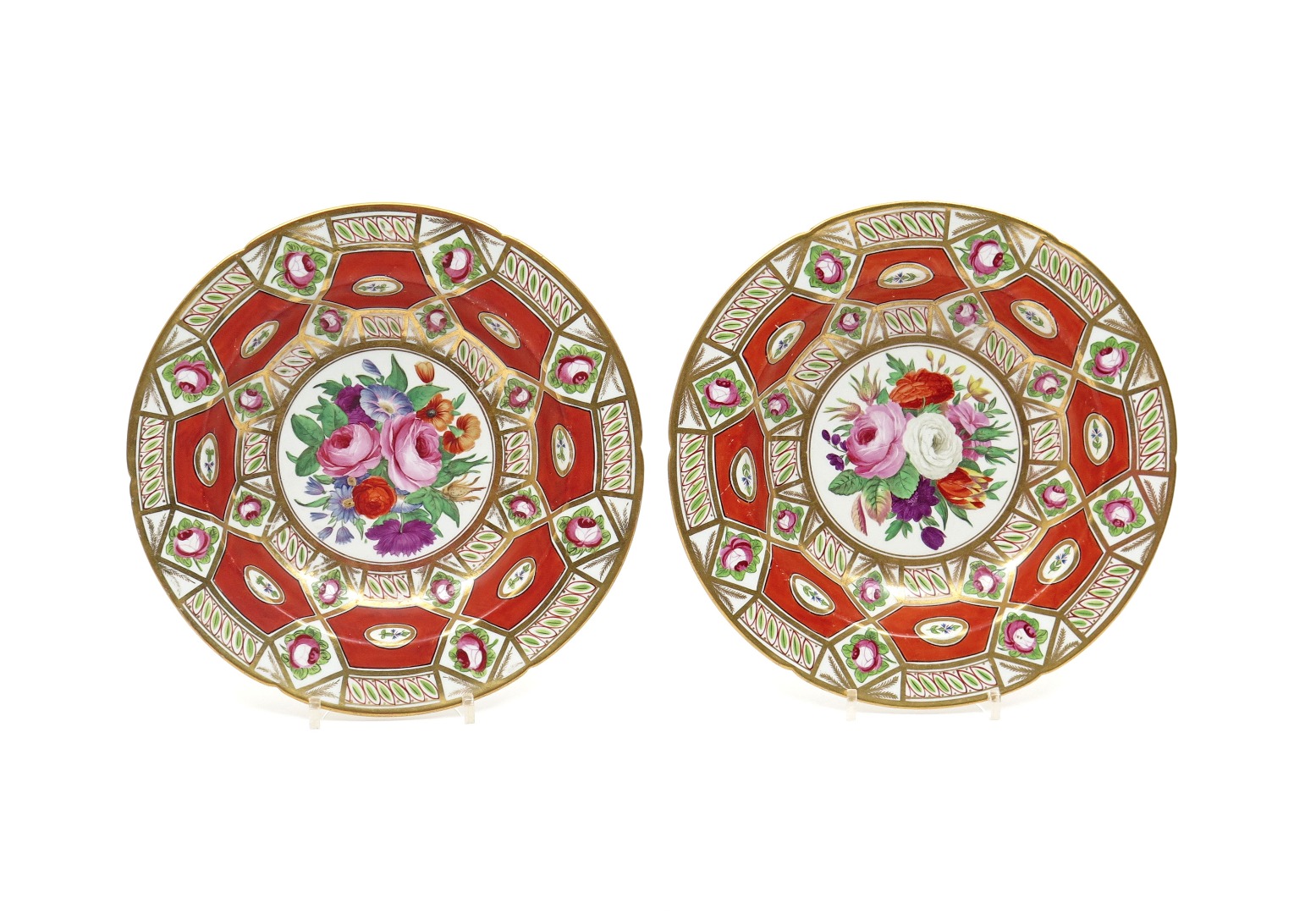 A pair of Coalport soup plates c.1820, richly decorated in the Church Gresley pattern, with small cornflower florets reserved in hexagonal red panels amidst smaller panels of pink rosebuds and stylized leaves, the wells with bold floral arrangements, 24.7cm. (2)
