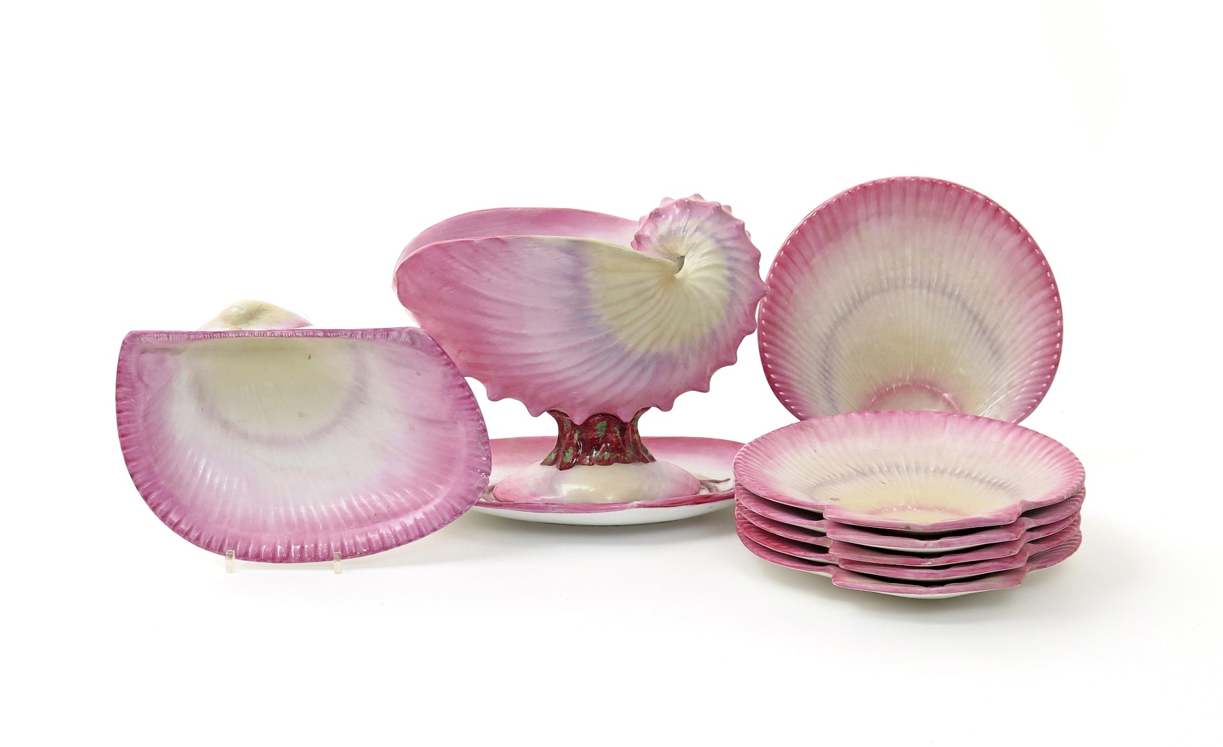 A Wedgwood Wreathed Shell part dessert service 19th century, the varied shell forms decorated in pattern 7035 with shaded pink around the edges, impressed marks, some pieces titled in green. Comprising: a nautilus shell comport and stand, an arca antiquata dish and six scallop shell plates. (9)