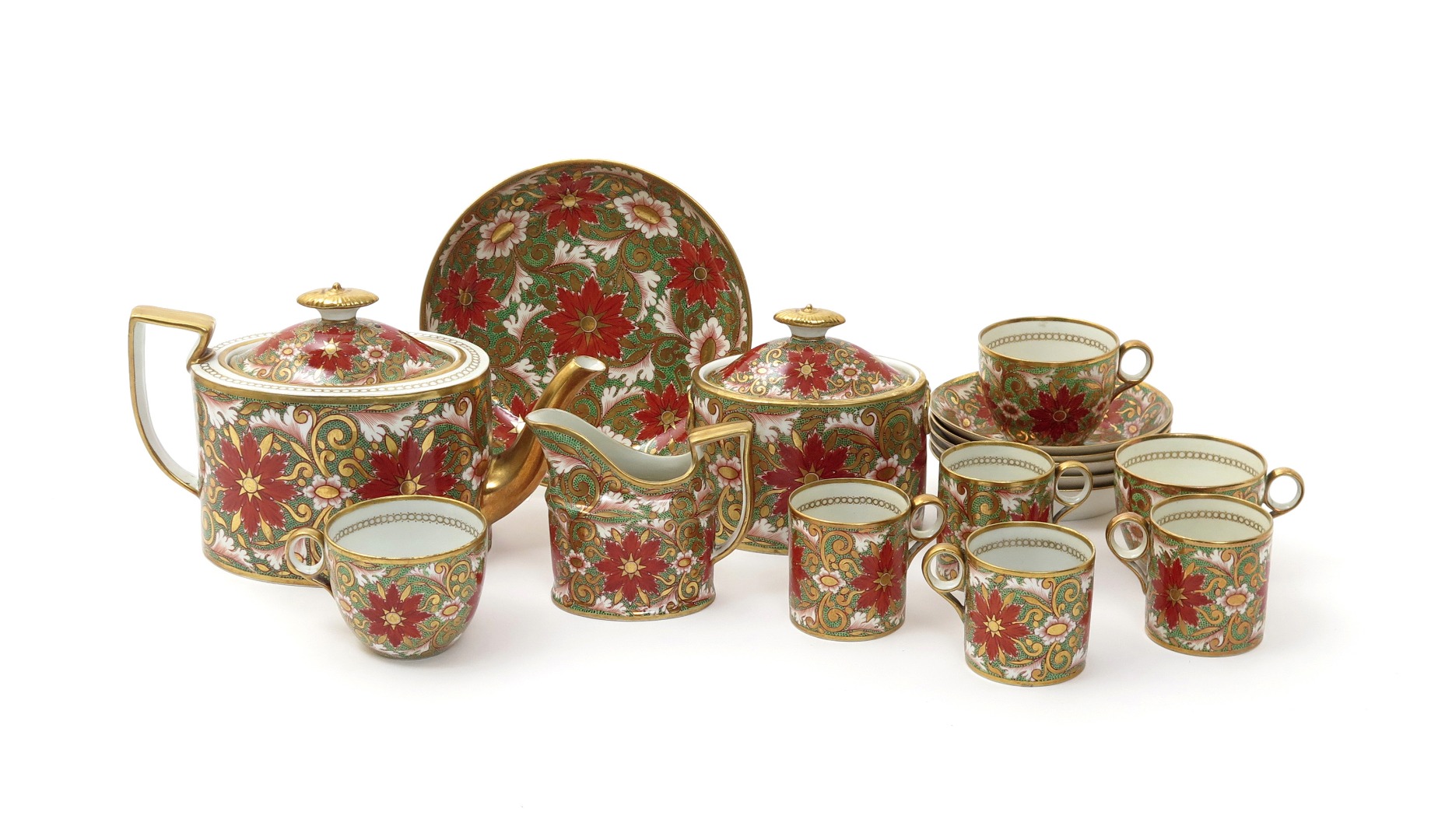 A Minton part tea service c.1820, richly decorated in pattern 178 with bold orange-red flowerheads amid formal foliate scrolls in red and gilt, reserved on a green dot ground, some damage and restoration. Comprising: a teapot and cover, a milk jug, a sucrier and cover, a slop bowl, a cake plate, three teacups, three coffee cans and five saucers. (18)