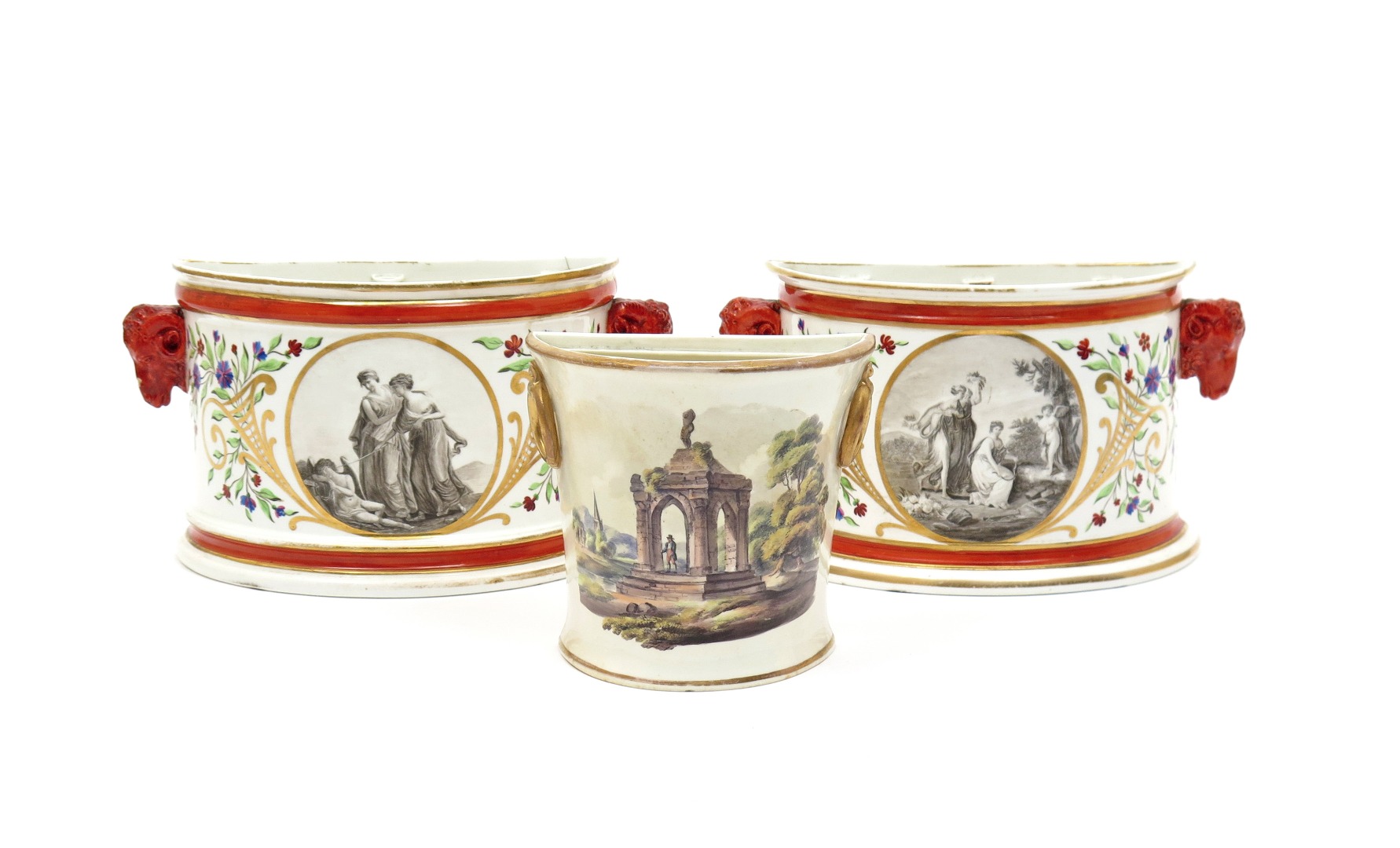 A pair of Derby bough pots c.1795, the D shapes painted with en grisaille panels of Virgins awakening Cupid, and of nymphs mocking Cupid tied to a tree, after Angelica Kauffmann, between gilt cornucopia issuing cornflowers and other blooms, with red rams head handles, and a smaller English porcelain bough pot painted with a figure beneath Classical ruins, the covers lacking, 24.8cm max. (3)