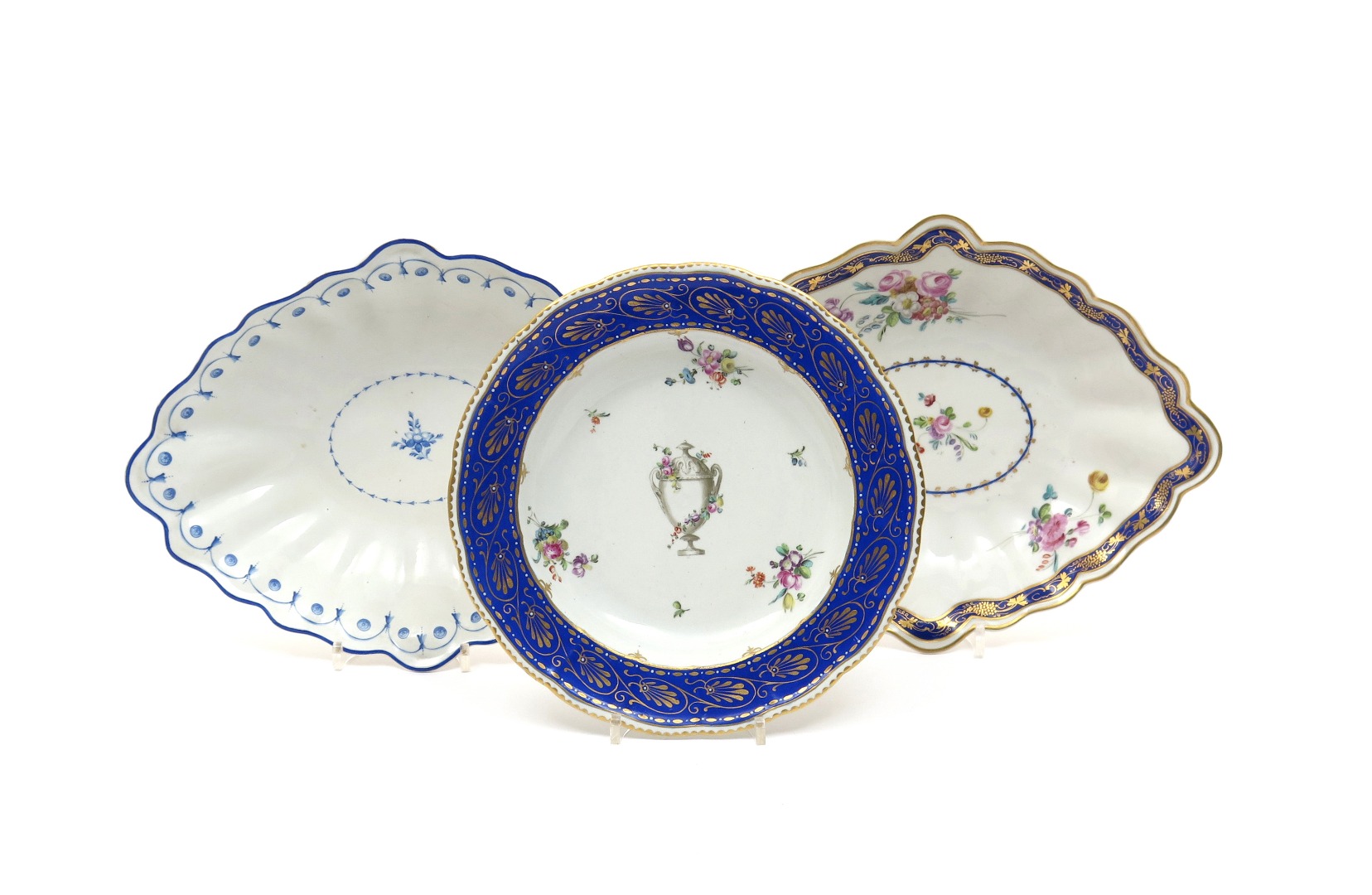 Two Chelsea-Derby dessert dishes c.1780, one painted with polychrome flower sprays within a gilt grapevine border on blue, the other with a blue monochrome swag and roundel border, and a shallow bowl with an urn draped in flowers, 31.5cm max. (3)