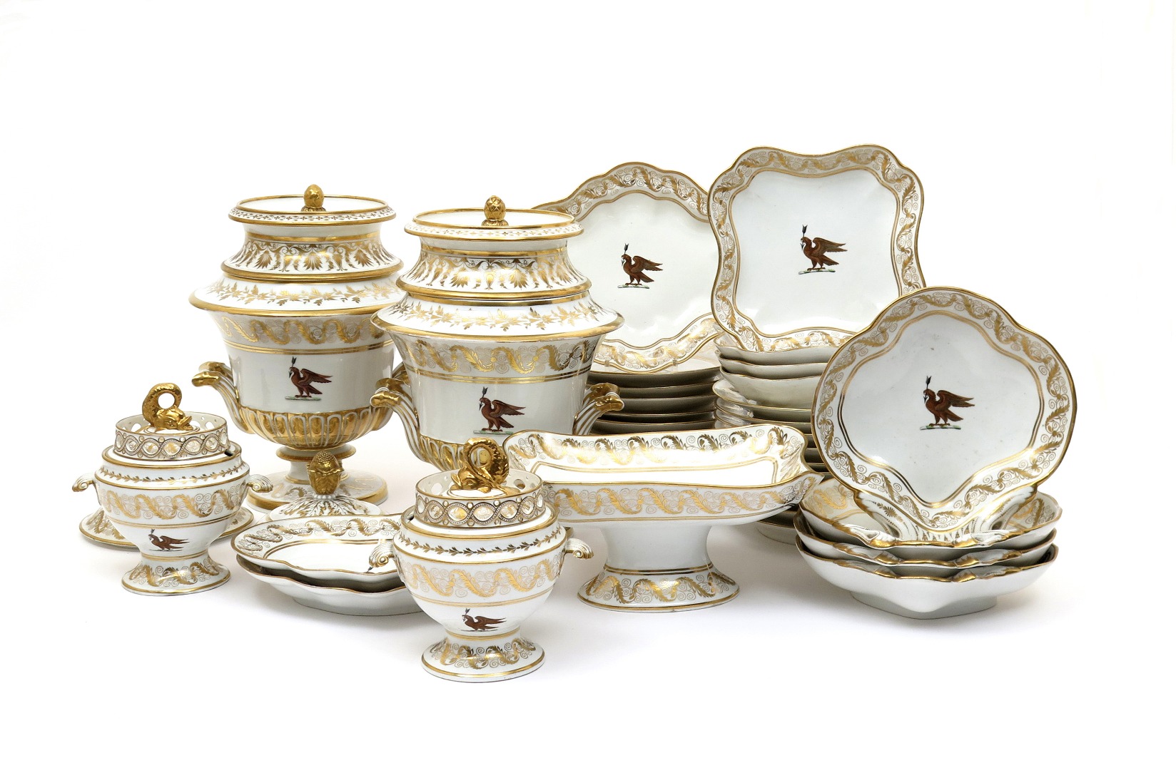 A Chamberlain's Worcester part armorial dessert service c.1800, decorated with the crest of an eagle holding an arrow in its beak, within gilt foliate scroll borders, iron red script marks. Comprising: two ice pails with a choice of two covers for each, two sauce tureens and covers, four square dishes, four shell-shaped dishes, two kidney-shaped dishes, a quatrefoil dish, a tazza and twenty plates. (42)