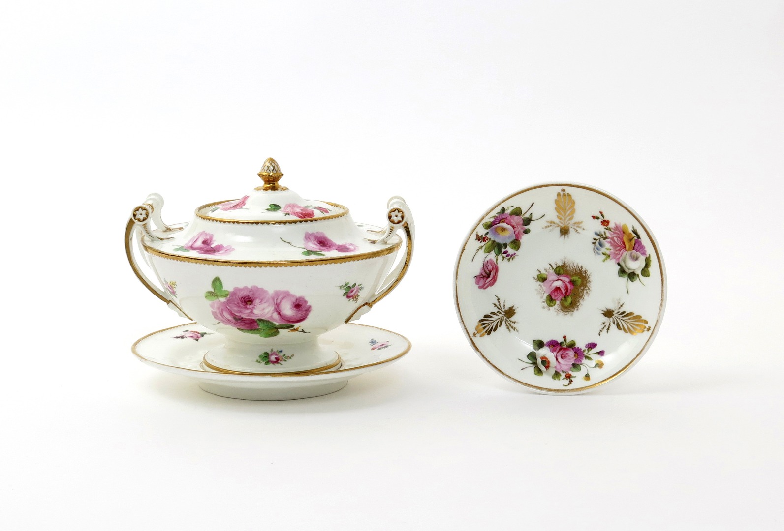 A Nantgarw sauce tureen with cover and stand c.1818-20, the circular shape painted probably locally with arrangements of pink roses within gilt dentil rims, impressed NANTGARW-CW marks, and a saucer decorated in the manner of William Billingsley's Duncombe pattern with flower sprays and gilt palmettes, some gilt wear, the tureen's cover associated, 19cm max. (4)