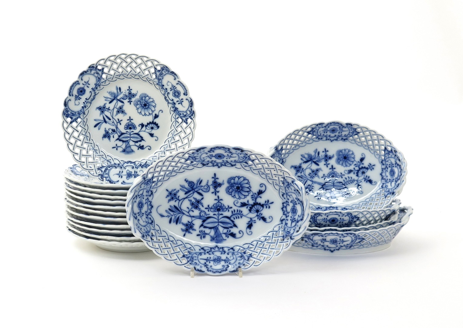 A Meissen-style part dessert service late 19th/20th century, decorated in underglaze blue with the Onion or Zweibelmuster pattern within reticulated rims. Comprising: two large and three small two-handled basket dishes, and twelve plates. (17)