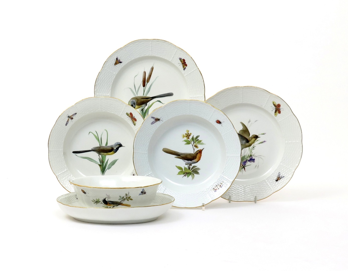 A Meissen part ornithological service 19th/20th century, painted with different birds perched on leafy sprigs, the osier-moulded rims with scattered moths, beetles and flying insects, blue crossed swords marks. Comprising: a bowl with built-in stand, two plates and two soup bowls. (5)