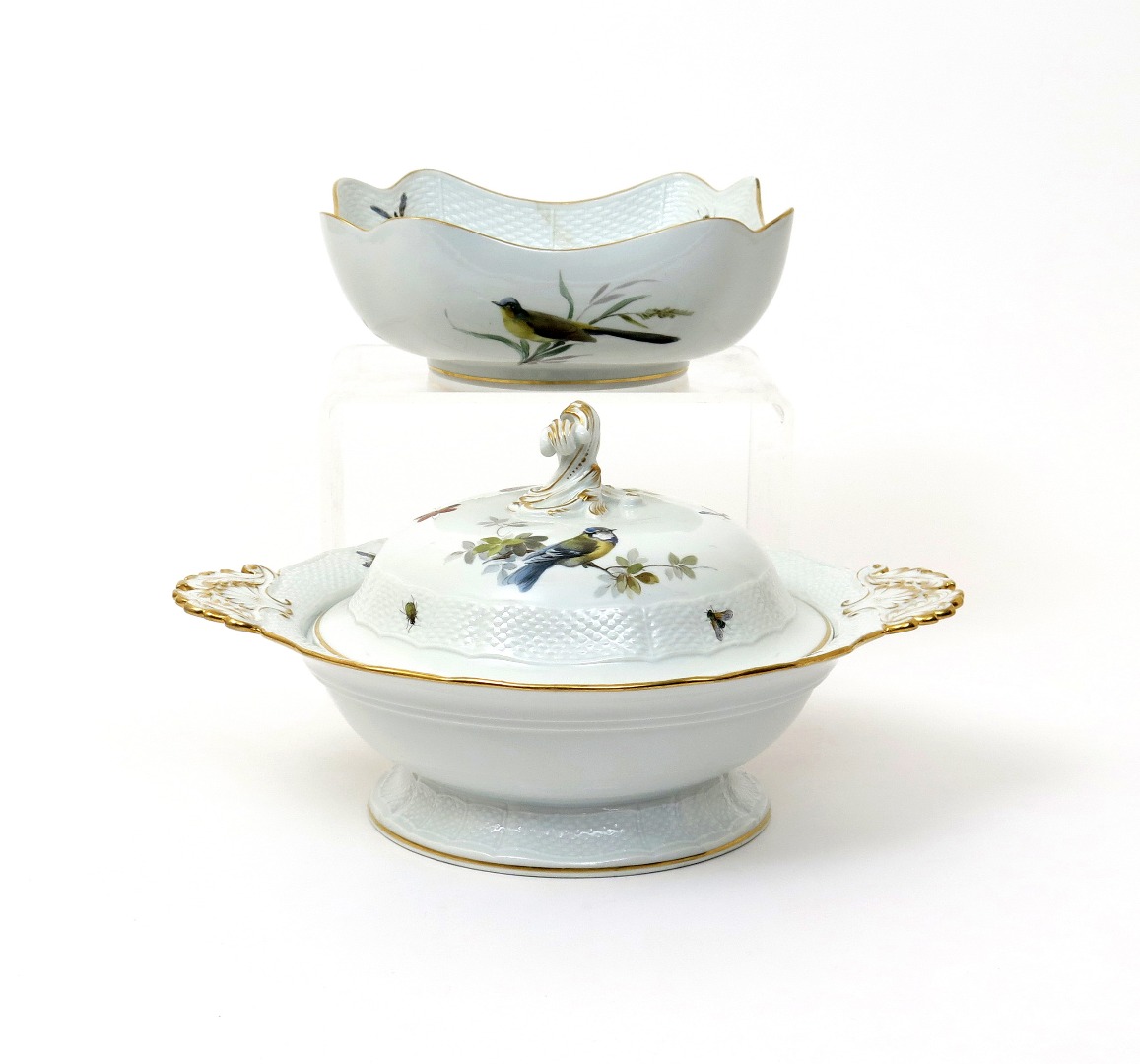 A Meissen two-handled tureen and cover 19th/20th century, painted with songbirds on flowering branches, and a matching square bowl with similar decoration, the osier-moulded rims painted with colourful moths and flying insects, blue crossed swords marks, a section of the bowl broken and restuck, 34.5cm across. (3)